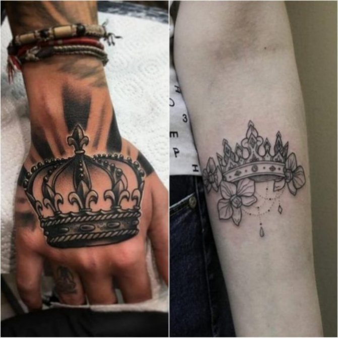 Non seulement le beau sexe, mais aussi de nombreux hommes préfèrent porter sur leur corps exactement l'image de la couronne, dont la valeur sera quelque peu différente de l'interprétation féminine. En règle générale, les hommes préfèrent fourrer cette image sur leurs mains, en particulier cette main et ce poignet.