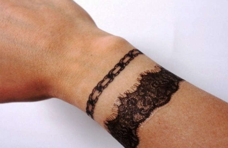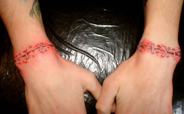 Bracelet - Il peut s'agir d'une imitation d'horloge, indiquant le caractère éphémère de la vie, d'un bracelet de fil de fer barbelé ou encore d'un tatouage en 3D avec imitation de mains cousues, ongles brutaux et audacieux à caractère purement décoratif.
