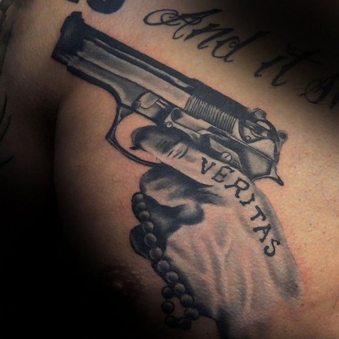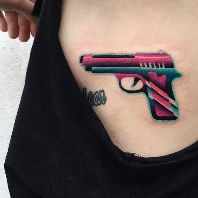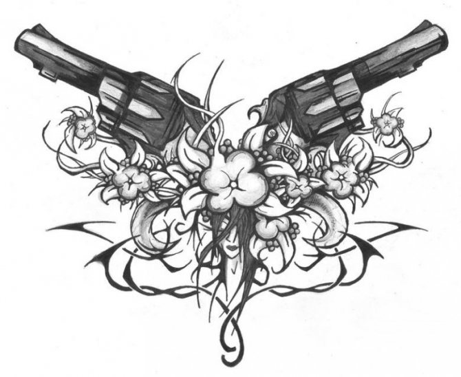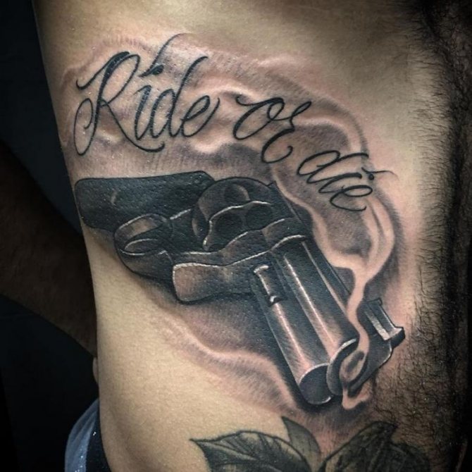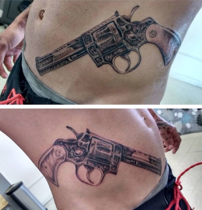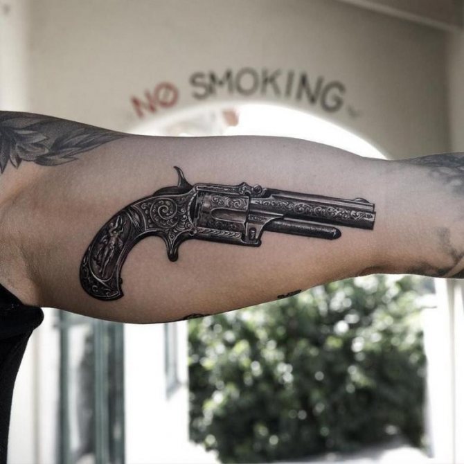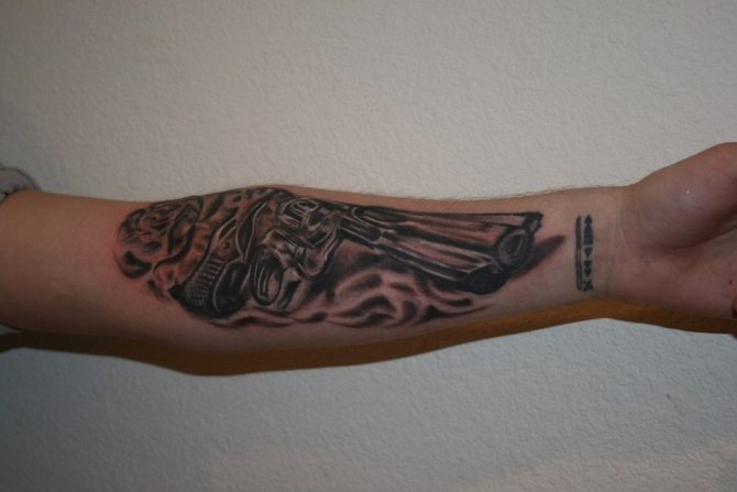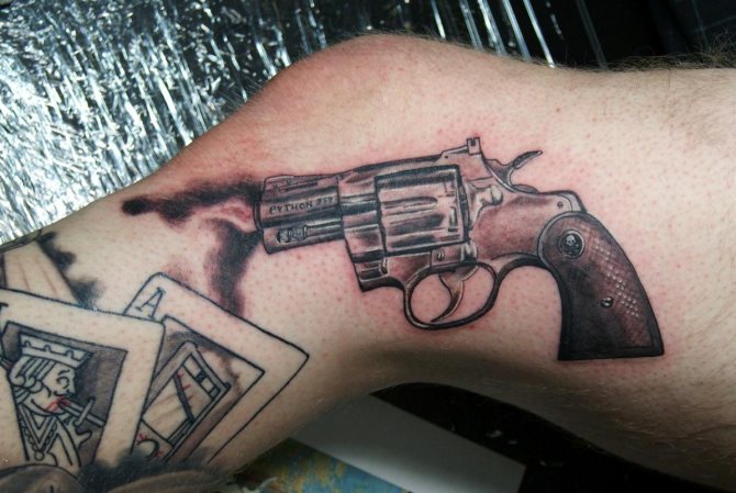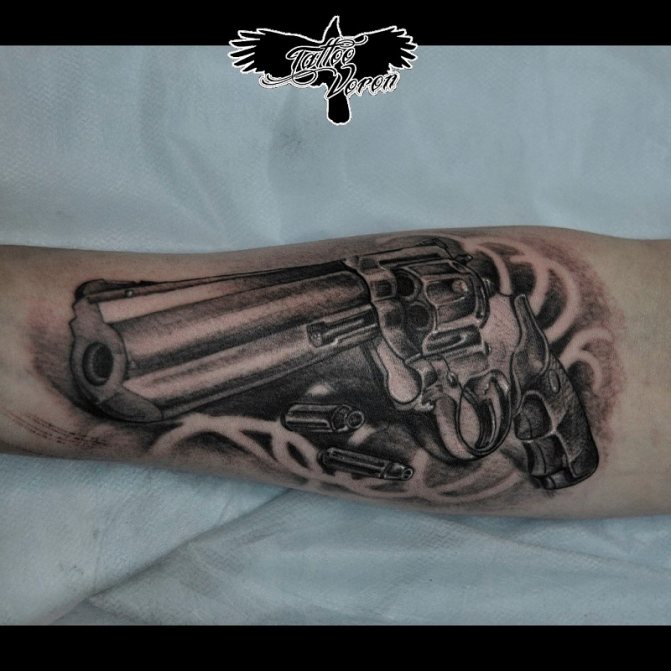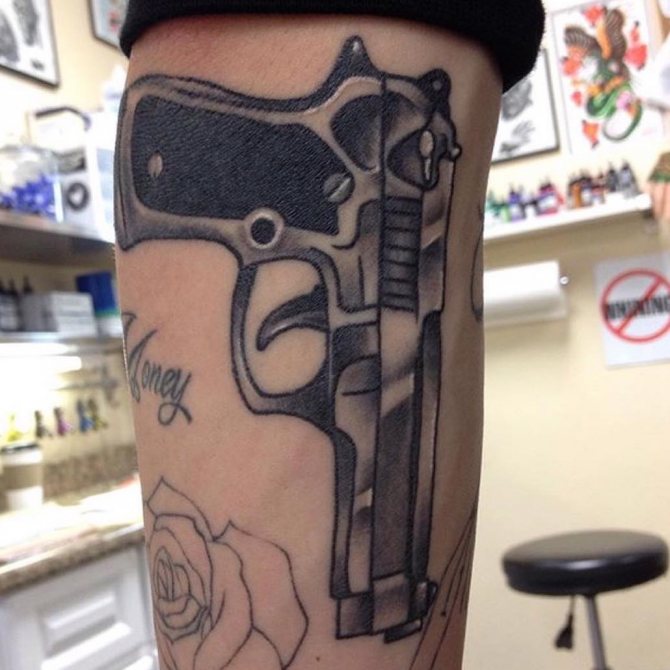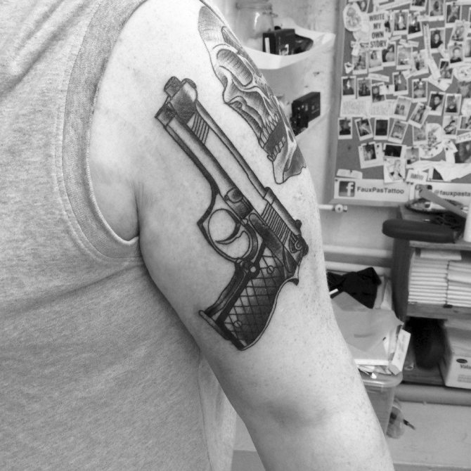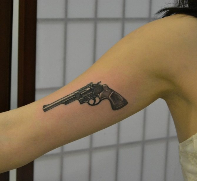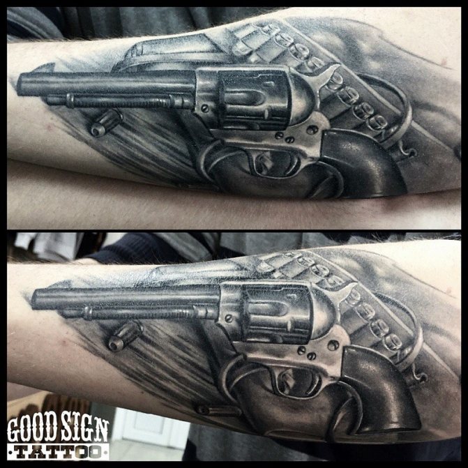 Tout le monde l'a vu en personne, en photo. Tout le monde sait combien cette arme est dangereuse. Un tir, homme, animal mort. À certains moments, elle peut sauver une vie humaine. Bien que la signification soit investie par la personne qui a réalisé le croquis, le plus souvent les gens tatouent une arme à feu pour montrer le danger du personnage.