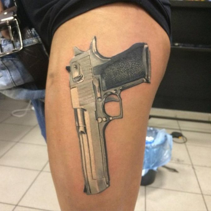 Tatouage de pistolet : sur la main, sur la jambe, sur la hanche et autres options