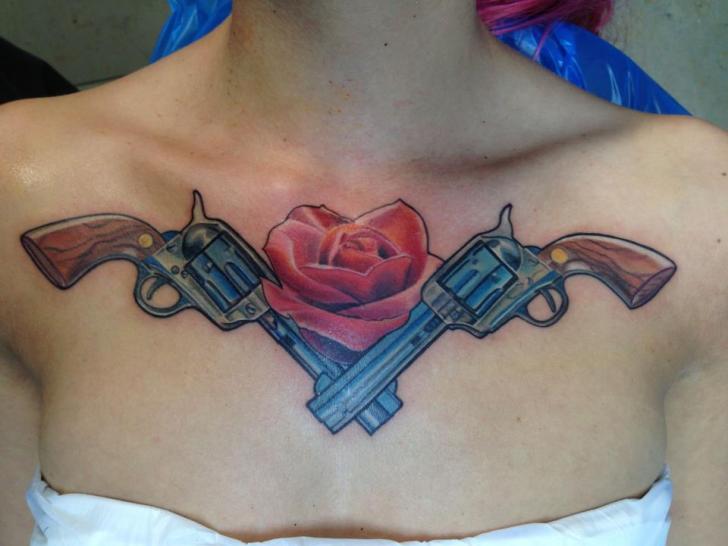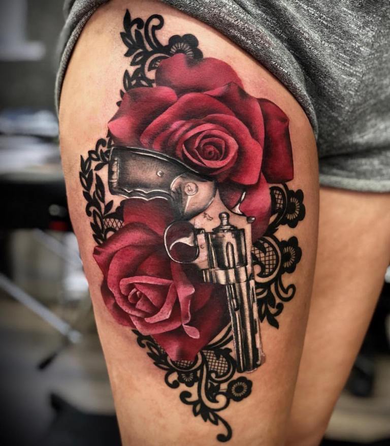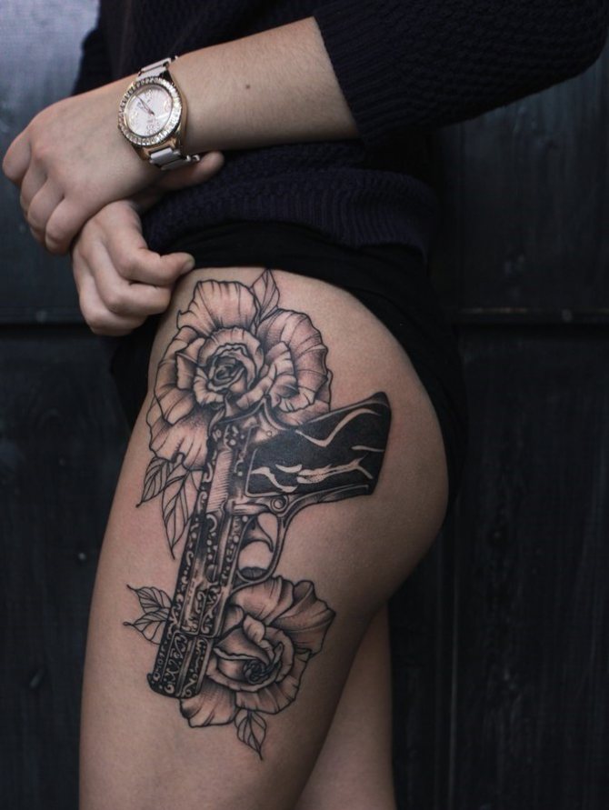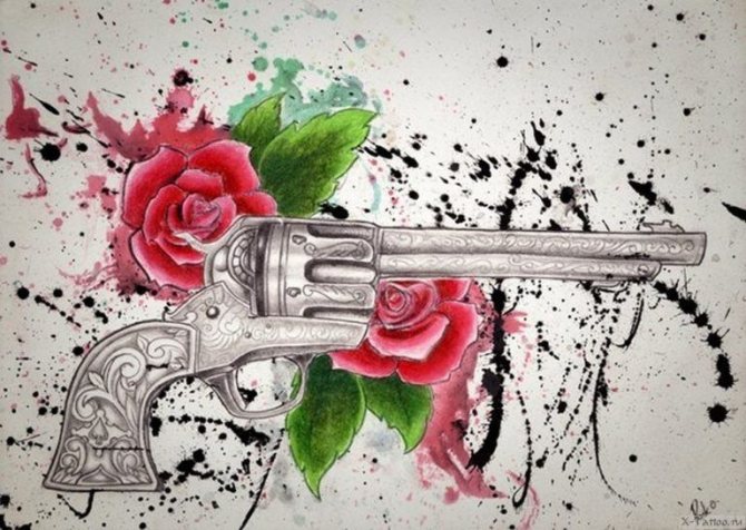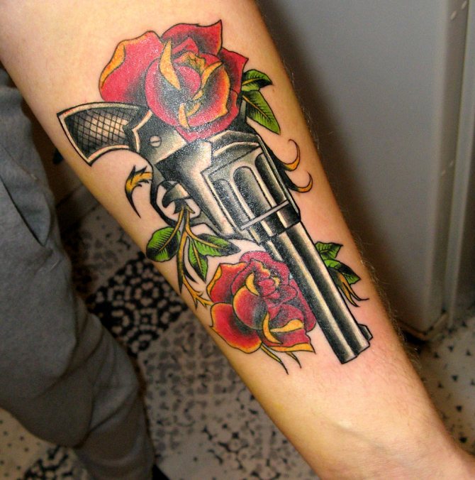 Une arme à feu représentée par une rose indique à son propriétaire à quel point il est jaloux. Pour le porteur d'un pistolet et d'une rose tatouée, la loyauté, la fidélité passe avant tout. Le tromper sera une vengeance, de la haine.