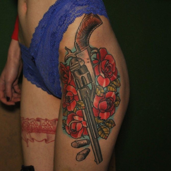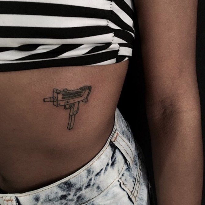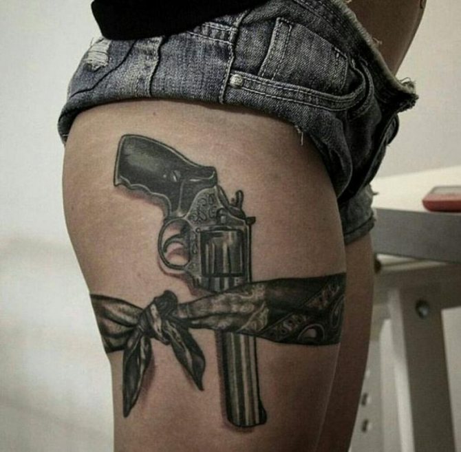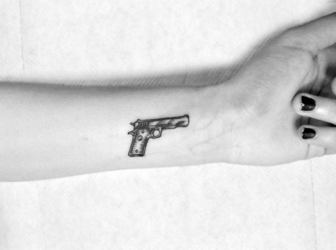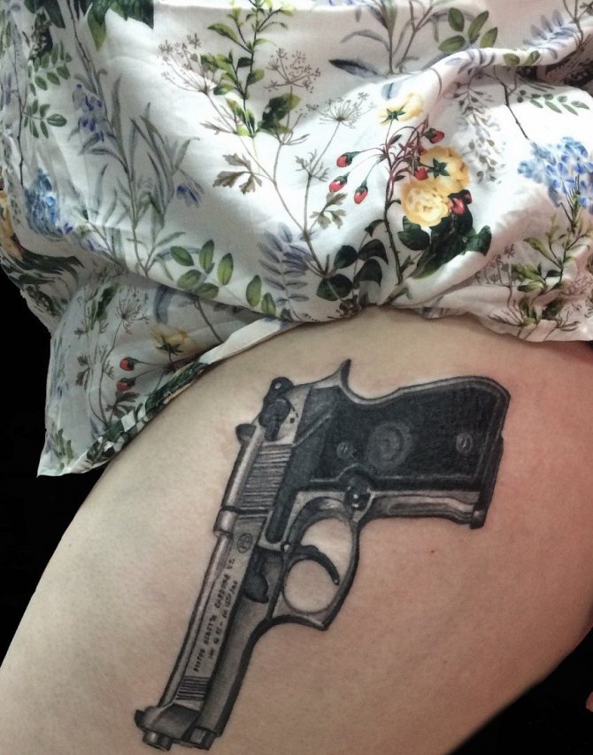 Avec un tatouage de pistolet, une fille peut exprimer son indépendance. Le tatouage est une sorte d'amulette de la liberté personnelle. Les propriétaires d'un tel tatouage ne se donnent pas en spectacle et sont capables de se protéger. Ce tatouage peut refléter une certaine légèreté de la jeune fille, car pour l'adrénaline, elle est capable de prendre des risques injustifiés.