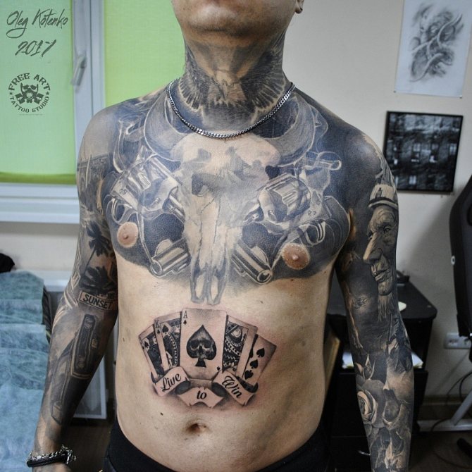 Les tatouages avec des armes se retrouvent aussi bien seuls que par paires : des poignards croisés, deux revolvers sur le ventre et des mitrailleuses à différents endroits. Les personnes présentant ce motif sur leur corps ont des talents cachés qu'elles sont les seules à connaître. tant en couleur qu'en noir, se révélera être une œuvre digne d'intérêt.