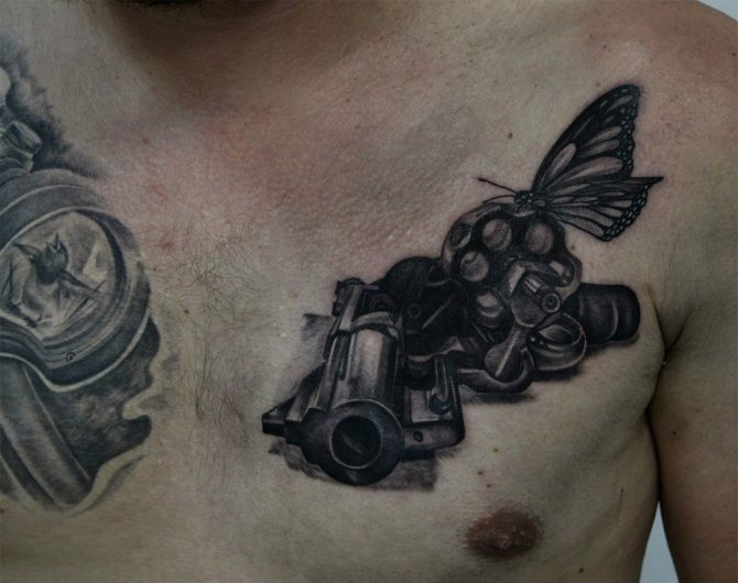 Les options pour les hommes avec des tatouages d'armes soulignent la force physique, la capacité à se défendre. Les suggestions qui présentent un intérêt particulier sont les suivantes :