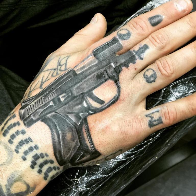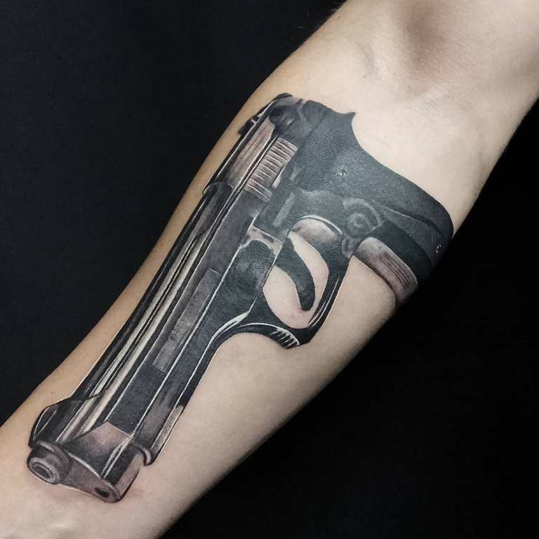Typiquement, un tatouage d'arme à feu suggère que la personne qui a réalisé les images sur le corps donne la priorité à la force physique. À première vue, il semble que la personne qui a fait ce tatouage de pistolet ait une propension à la cruauté, à l'impitoyabilité, à la violence, mais psychologiquement, elle essaie d'éviter l'agression du monde extérieur. Le tatouage reflète la psychologie d'une personne, ses pensées, son anxiété.
