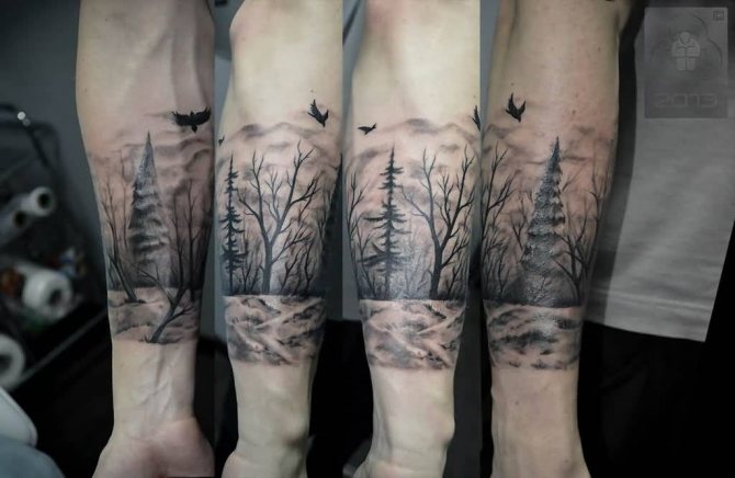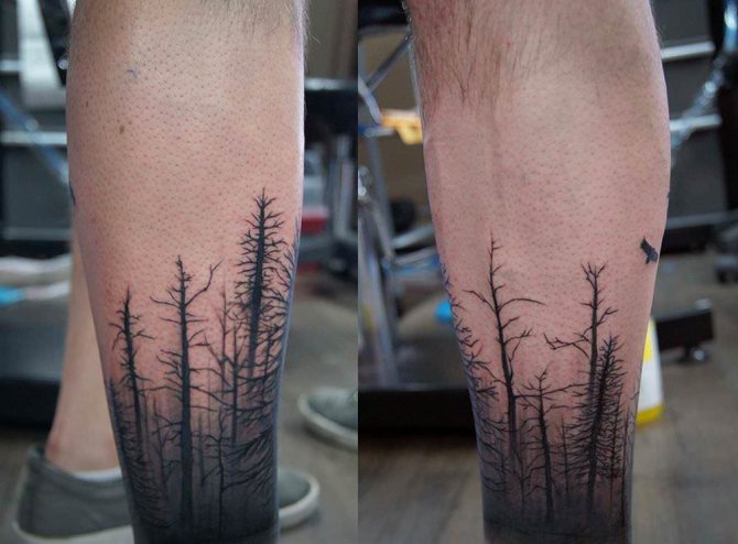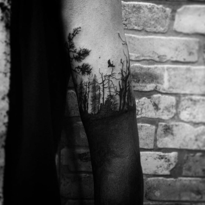 Un oiseau qui tourne au-dessus de la forêt symbolise les défenseurs qui gardent l'intérieur d'une personne et éloignent la négativité. Si l'oiseau est assis sur l'une des branches, cela signifie que la personne est assez conservatrice et a un caractère stable. Ces personnes sont fortes en esprit et ont un but précis. En général, on peut dire que le tatouage en forme de forêt symbolise la conscience dans la vie quotidienne, l'éternité, la cohérence dans leurs jugements et la sagesse profonde.