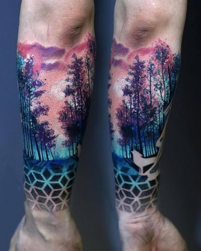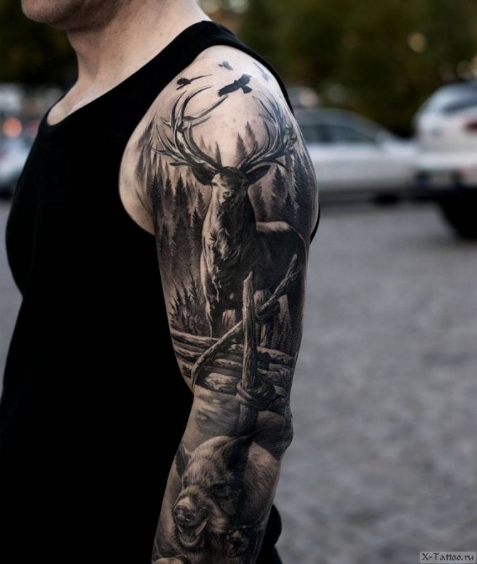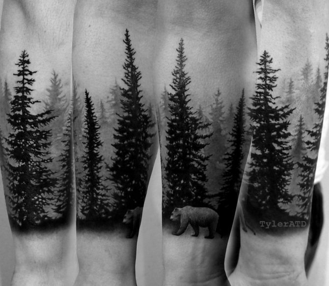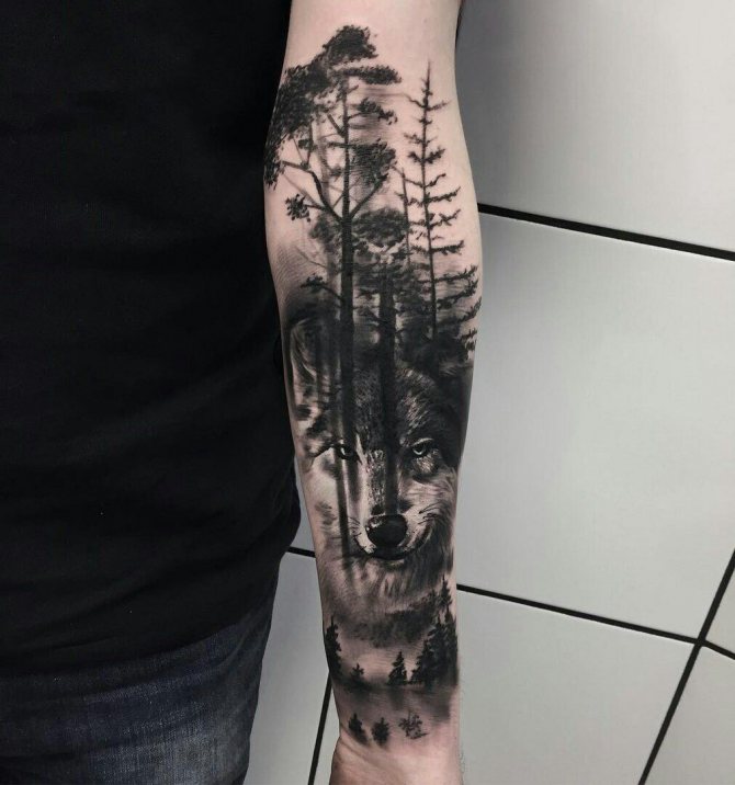 Les tatouages représentant un animal au premier plan d'une forêt sont de plus en plus populaires. Dessiner un ours suggère que l'homme est le maître de sa vie et sait exactement où il va. Il est également un bon juge des personnes et sait analyser leur comportement. Le loup est un indicateur de confiance en soi, d'autosuffisance. La chouette, en revanche, est choisie par les personnes prudentes et intelligentes. L'image d'un renard représente la capacité à rencontrer des gens et la flexibilité de leur esprit.