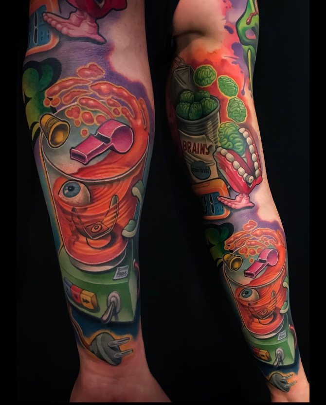 Le style de tatouage le plus sauvage. Son essence même est imprégnée d'agressivité, de contestation de la société et de rejet des normes conventionnelles. Le tatouage de manche de polka thrash est une façon de s'exalter au-dessus du reste de la foule et de montrer que vous êtes meilleur qu'eux.