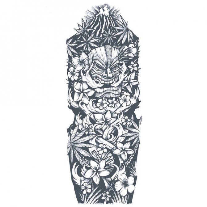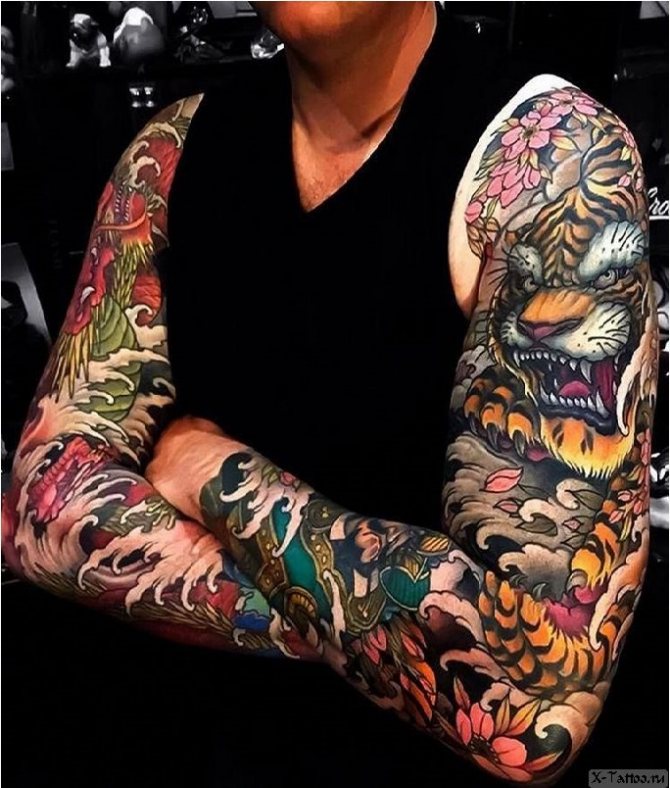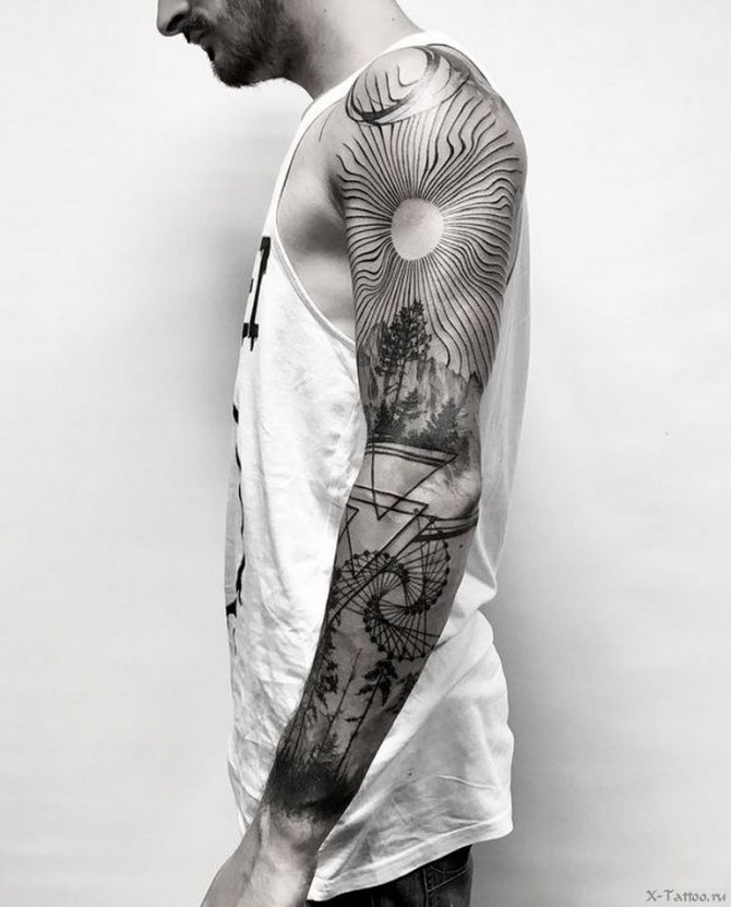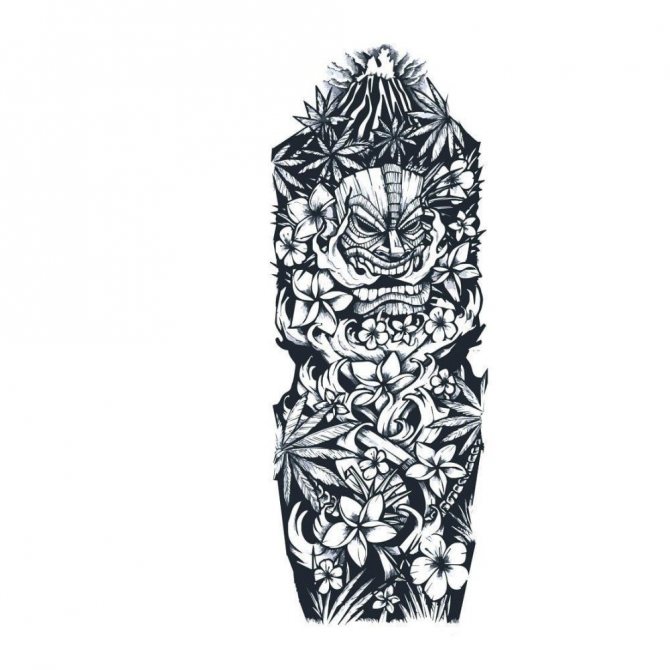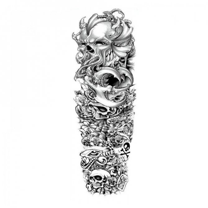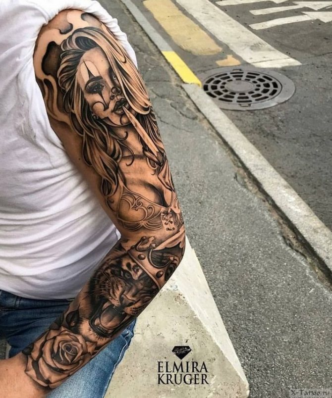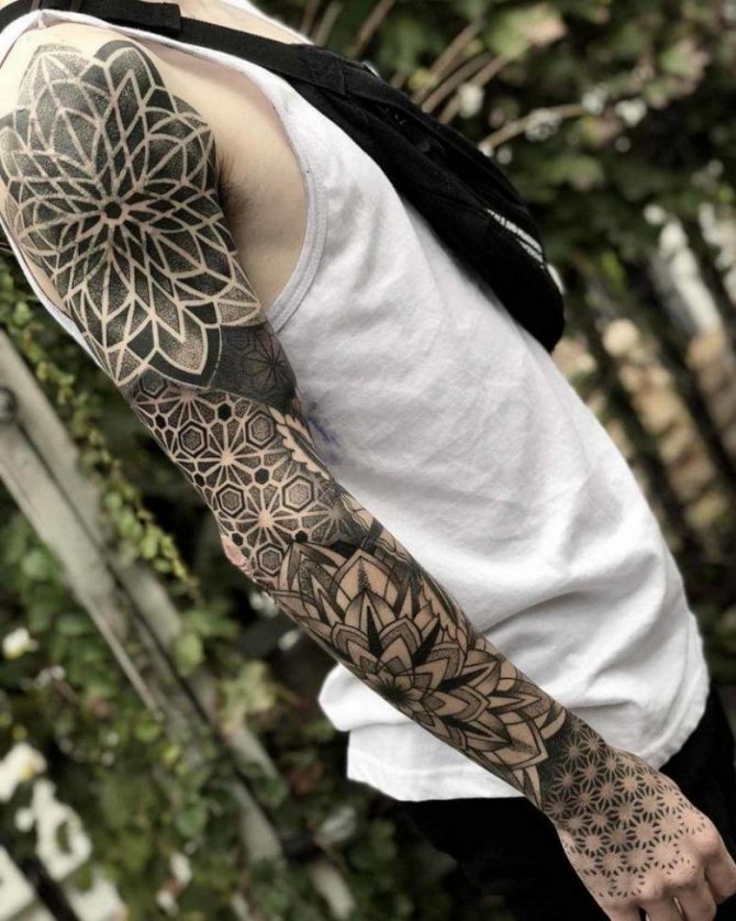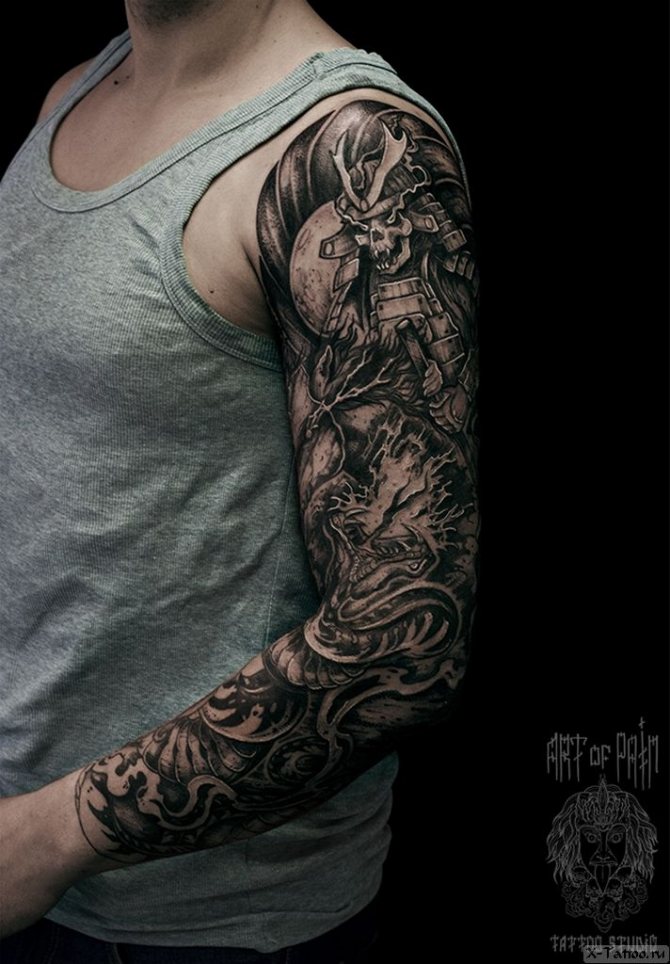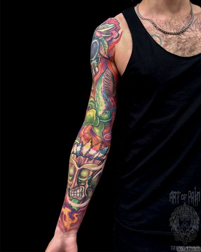 Le travail le plus difficile, tant pour le maître que pour le client, est une manche complète. Il s'agit d'une toile entière, représentant une composition artistique, offrant une latitude maximale pour la réalisation de fantasmes. Le dessin commencera à l'épaule et se terminera au poignet. Les croquis ayant une certaine charge sémantique, les motifs et ornements authentiques, l'abstraction et bien d'autres choses encore sont appropriés ici. Le croquis le plus courant aujourd'hui est celui des motifs celtiques, de la Polynésie.