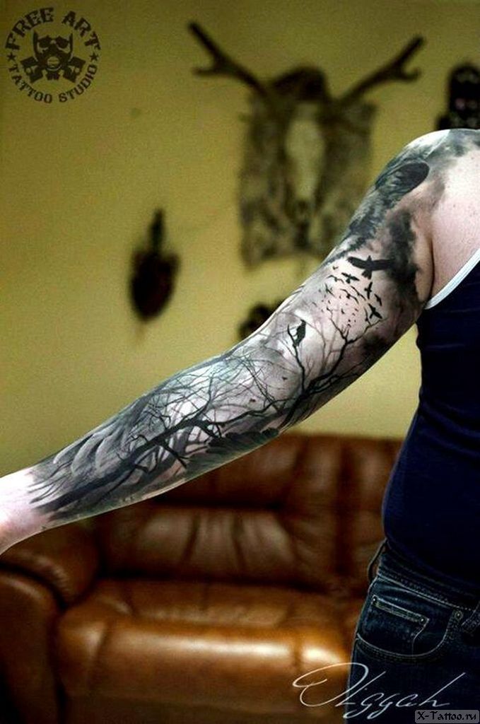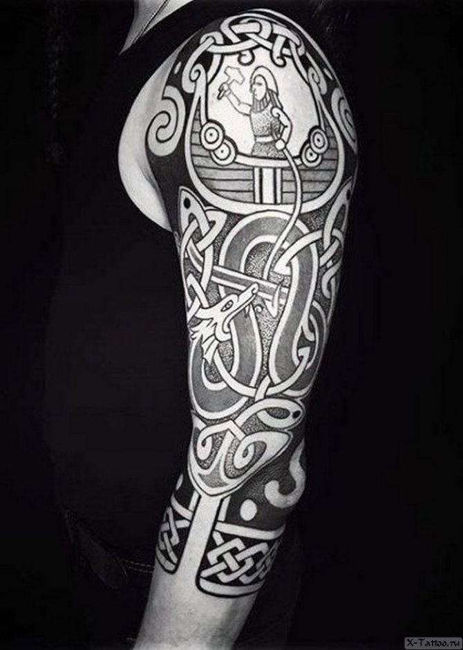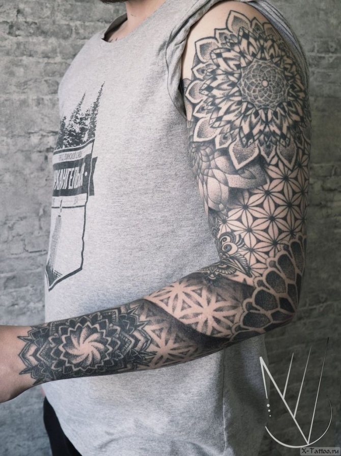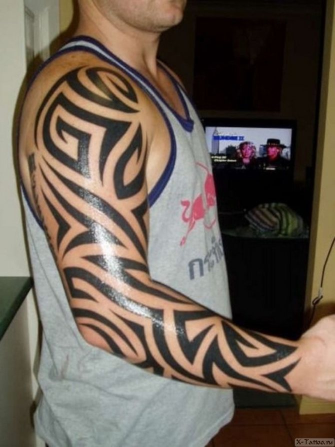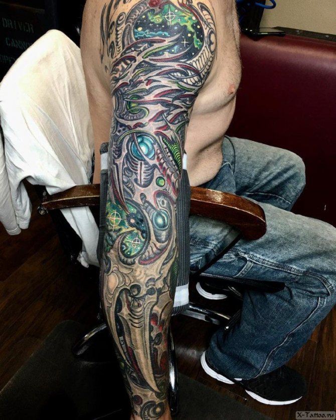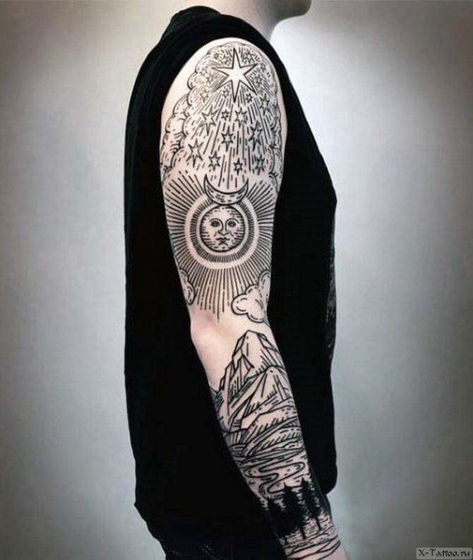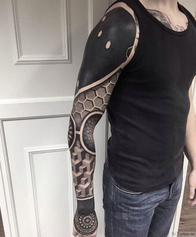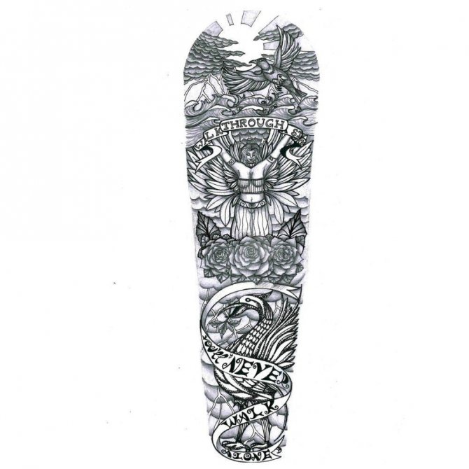Le travail le plus difficile, tant pour le maître que pour le client, est une manche complète. Il s'agit d'une toile entière, représentant une composition artistique, offrant une latitude maximale pour la réalisation de fantasmes. Le dessin commencera à l'épaule et se terminera au poignet. Les croquis ayant une certaine charge sémantique, les motifs et ornements authentiques, l'abstraction et bien d'autres choses encore sont appropriés ici. Le croquis le plus courant aujourd'hui est celui des motifs celtiques, de la Polynésie.