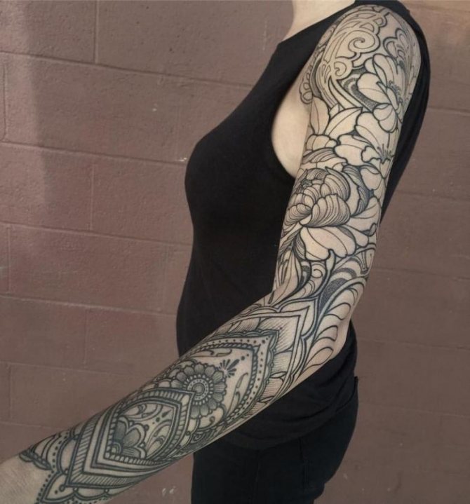 Mais, par exemple, en combinant le blackwork avec l'ornemental, vous pouvez obtenir un excellent croquis de manche de tatouage unique. Une photo de ce type n'aura pas honte d'être mise sur les réseaux sociaux.