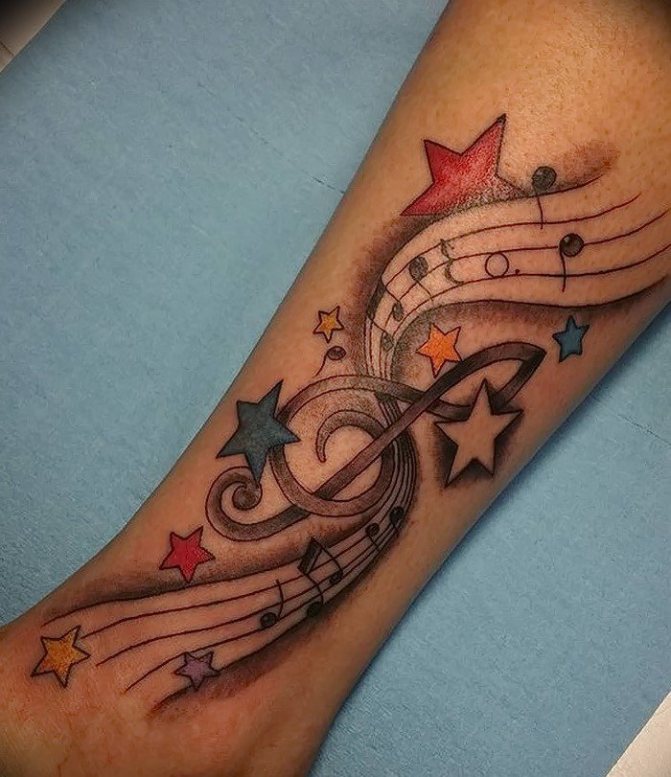 Tout objet ou phénomène lié à la musique peut être utilisé pour créer une composition colorée. Quant aux styles de tatouages, le thème de la musique n'a pas non plus de restrictions.