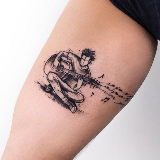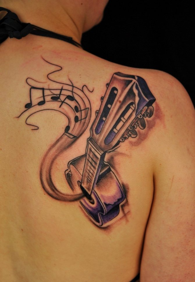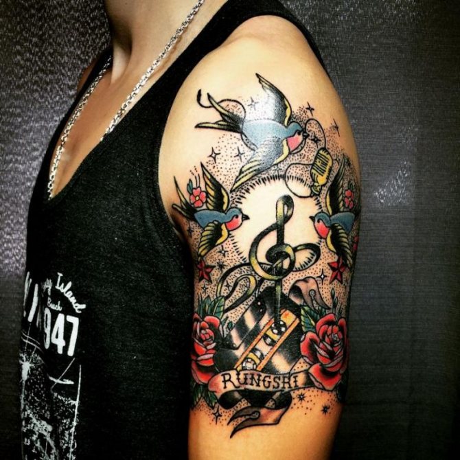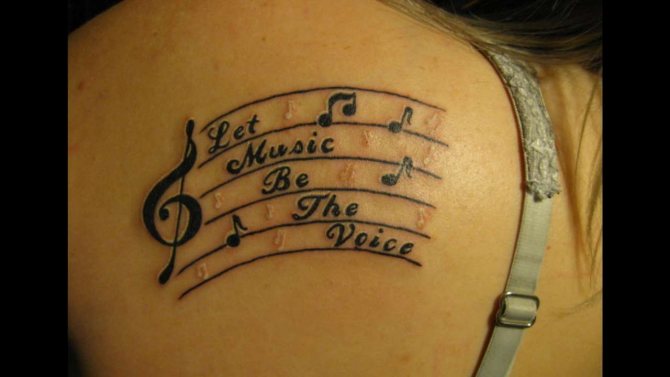 La musique de tatouage convient aux personnes créatives. Dans l'idée même du symbolisme réside l'optimisme et l'aspiration à l'épanouissement personnel. La musique peut être représentée par des notes, un magnétophone ou un microphone.