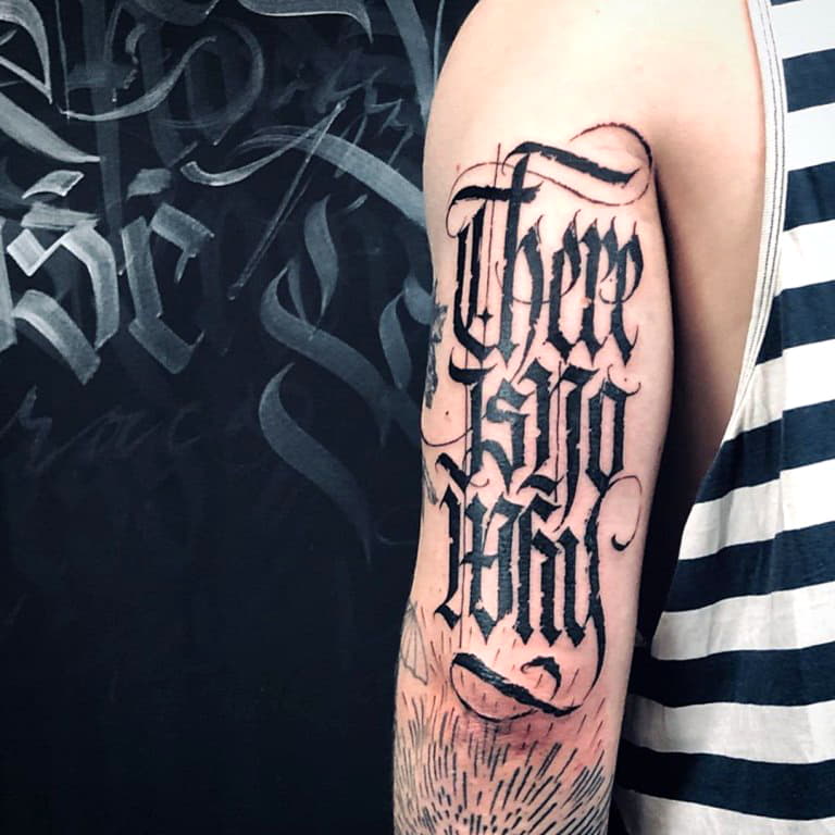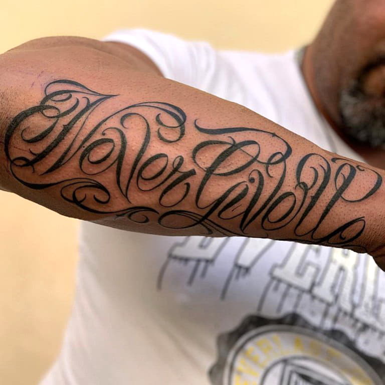Les styles chicano, thrash polka, gothique et minimaliste sont tous frappants sur l'avant-bras. Le texte peut être utilisé à l'intérieur ou à l'extérieur du bras.