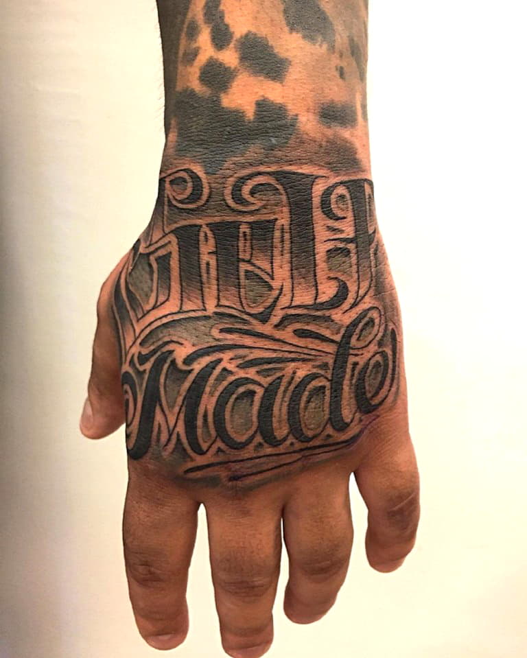 Sur les mains et les doigts, des tatouages de rappeur (généralement un pseudonyme) ou de simples phrases minimalistes : vie, amour, famille.