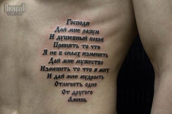 Sur la poitrine et l'abdomen, de nombreuses personnes tatouent l'année de naissance. Les filles se font également tatouer sous les seins, en enroulant le texte autour des courbes et des formes. Sur les côtés et les côtes, on trouve souvent des tatouages sur des thèmes religieux : prières, postulats, préceptes. L'une des plus courantes : économiser et préserver. Les mini-tatouages féminins avec un ou deux mots ornent gracieusement la clavicule.