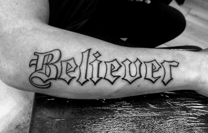 Les tatouages d'inscription peuvent se rapporter aux expériences de vie, aux principes et aux priorités d'un homme. Il y a beaucoup de philosophie et de moralité dans ces mots, comme le montrent les exemples de tatouages populaires suivants :
