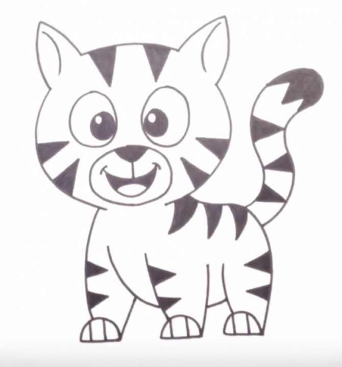 Le dessin simple et beau est prêt à être colorié. Les rayures, les moustaches, les yeux et une partie de la queue doivent être noirs, le nez en rose et le reste de l'espace en feutre orange. Cette leçon est la base de toutes les techniques ultérieures.