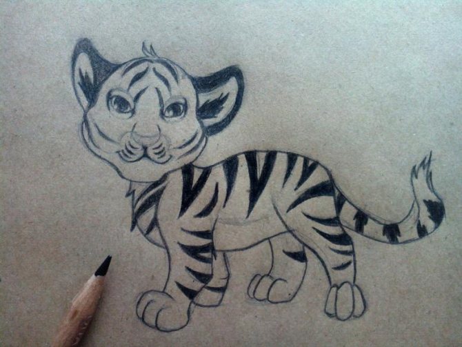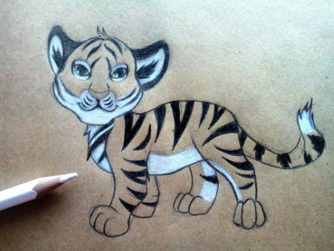 La prochaine technique décrite pour dessiner un bébé tigre est également au crayon. En cas de tentative infructueuse de tracer l'élément, toutes les choses inutiles peuvent être facilement nettoyées avec une gomme.