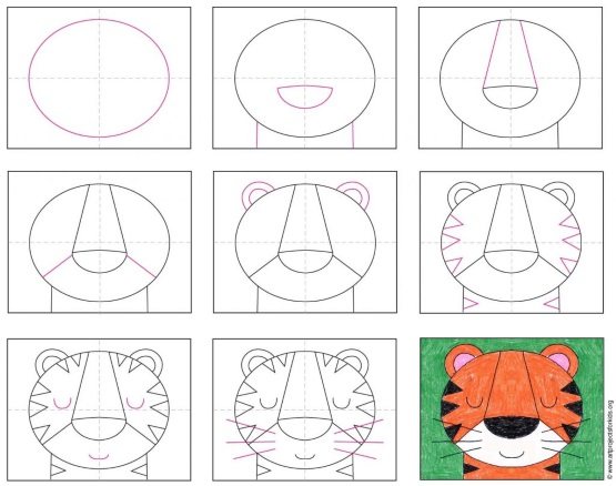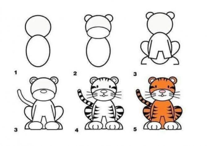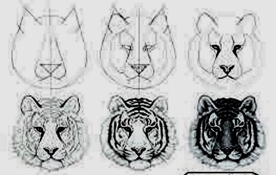 La technique de dessin est similaire à celle d'un chat. Le dessin de départ est meilleur avec le dessin de carrés. Ils sont dessinés avec une inclinaison, puis reliés par un triangle. Des formes carrées sont nécessaires pour dessiner les yeux du prédateur, au centre de chacune d'elles dessine un cercle. Le triangle est divisé par deux demi-cercles. Les cils du tigre des yeux.
