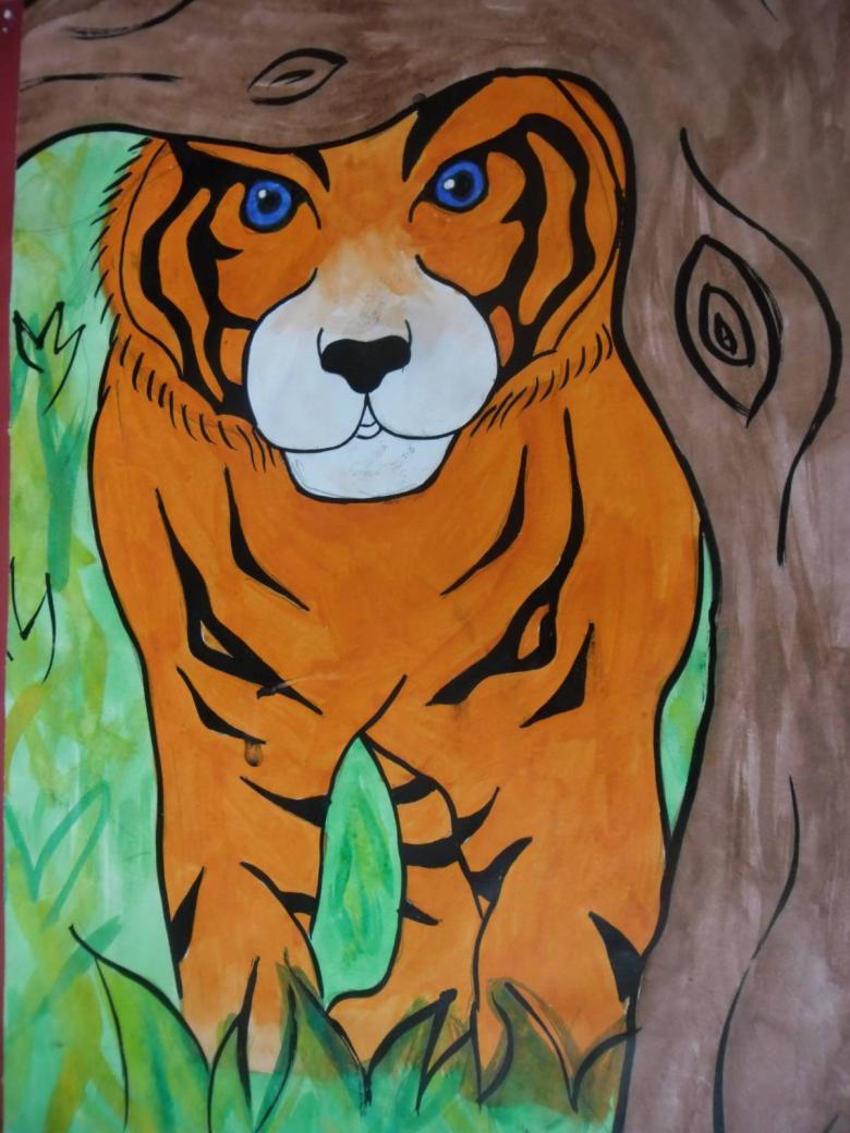 La silhouette du prédateur est tracée à l'encre noire et on procède au dépeçage du dessin. La partie principale est soulignée en orange, les yeux sont peints en jaune, la langue est rendue rose. Toutes les rayures sont dessinées en noir. Le gris passe une ombre dans l'image. On a un beau prédateur.