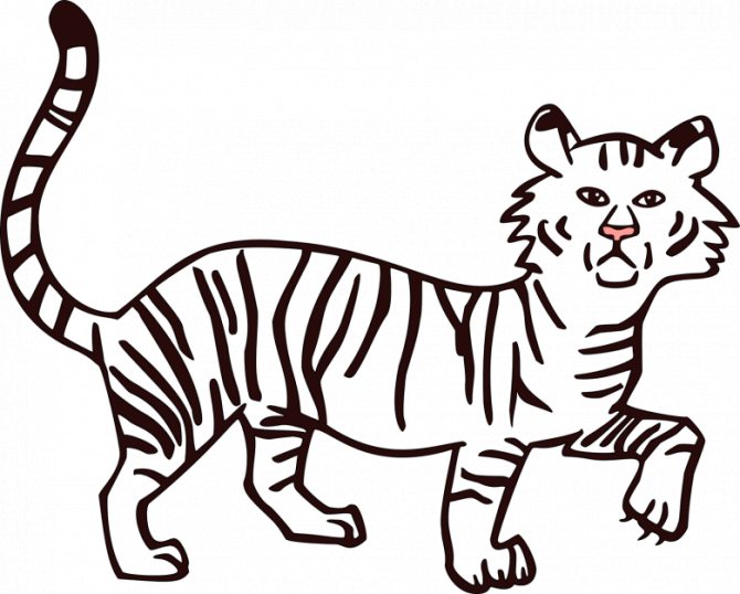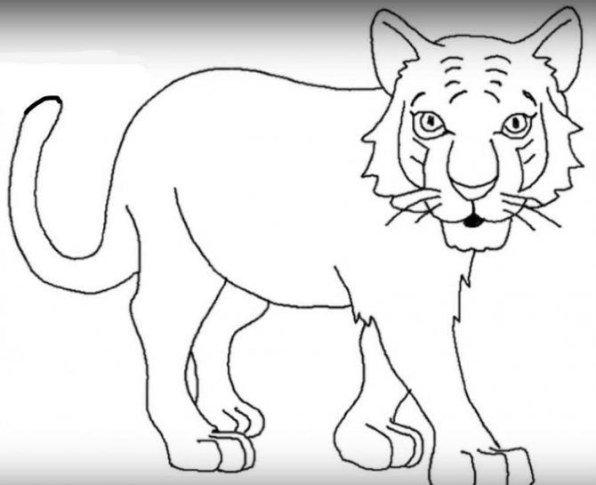 Ici, le tigre marche. Marche sur des pattes courtes et épaisses. (Ne dessinez pas un tigre avec de longues pattes).