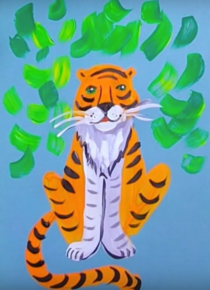 Un bon exemple de dessin de tigre est de faire un dessin avec de la peinture. Cette technique est facile à apprendre et ressemble en de nombreux points aux descriptions précédentes. Sur une page de scrapbooking figure la silhouette approximative du prédateur. La tête du tigre est dessinée en forme de demi-ovale, le nez est dessiné en forme de triangle. Dessinez les joues, le menton, les yeux et les oreilles comme dans les techniques décrites précédemment. Puis le dos est dessiné. Le fond principal de la feuille est peint en mélangeant les couleurs bleu et blanc.
