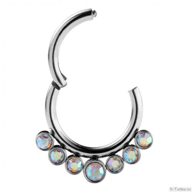 À propos, les torsades décoratives sont utilisées non seulement dans les circulaires, mais dans tous les types de bijoux de septum, à l'exception des clickers. Ils peuvent être de n'importe quelle couleur : or, noir, blanc, rouge et autres.