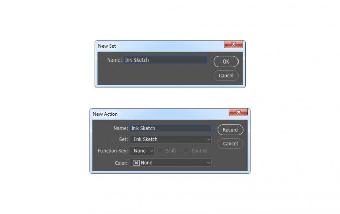 Dans cette section, nous allons commencer à enregistrer l'action. Aller dans le menu Fenêtre - Actions (et dans le panneau Actions, nous allons dans le menu Fenêtre - Actions. Actions (menu, cliquez sur l'icône en haut à droite du menu, sélectionnez Nouvelle série (Pour écrire un nouveau jeu, nommez Croquis à l'encre (Croquis à l'encre). Cliquez ensuite sur la même icône de menu, sélectionnez Nouvelle action (pour créer une nouvelle action, nommez-la Croquis à l'encre. (Appelez ça "Ink Sketch".)