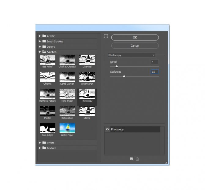 Aller au menu Filtre - Filtre Galerie - Sketch - Photocopie (Filtre - Galerie de filtres - Esquisse - Photocopie), ensemble Détail (à 2 et Darkness (à 5.