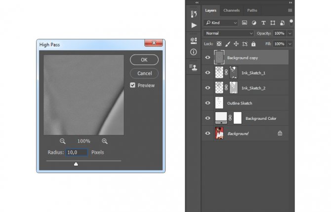 Appuyez sur Ctrl+Shift+U pour décolorer l'image. Aller au menu Filtre - Autres - Haut Passez . (Filtre - Autre - Contraste élevé), réglez le rayon sur 10 pixels.