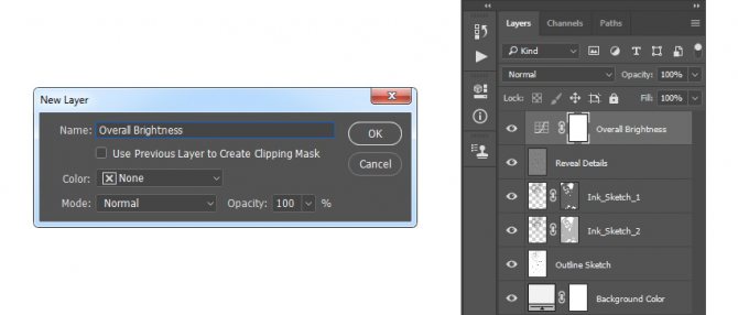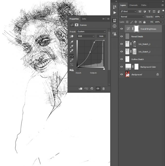 Dans cette section, nous apportons les derniers ajustements à la conception. Aller au menu Couche - Nouveau Réglage Couche - Courbes . (Calques - Nouveau calque de réglage - Courbes), créez un nouveau calque de réglage et nommez-le Luminosité globale (pour créer un nouveau calque de réglage appelé Luminosité globale).