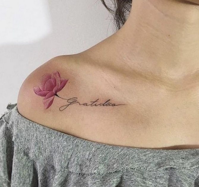 Les inscriptions sont un moyen polyvalent d'exprimer simplement et clairement l'idée qui se cache derrière votre tatouage. Vous n'avez pas à chercher de sens cachés ou de significations. L'inscription s'exprime toujours de manière directe, en indiquant votre vision de la vie, vos principes, vos rêves. Un tatouage sur la clavicule pour les filles sous la forme d'une inscription est très sophistiqué et souligne la beauté des lignes du corps.