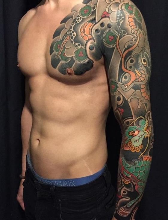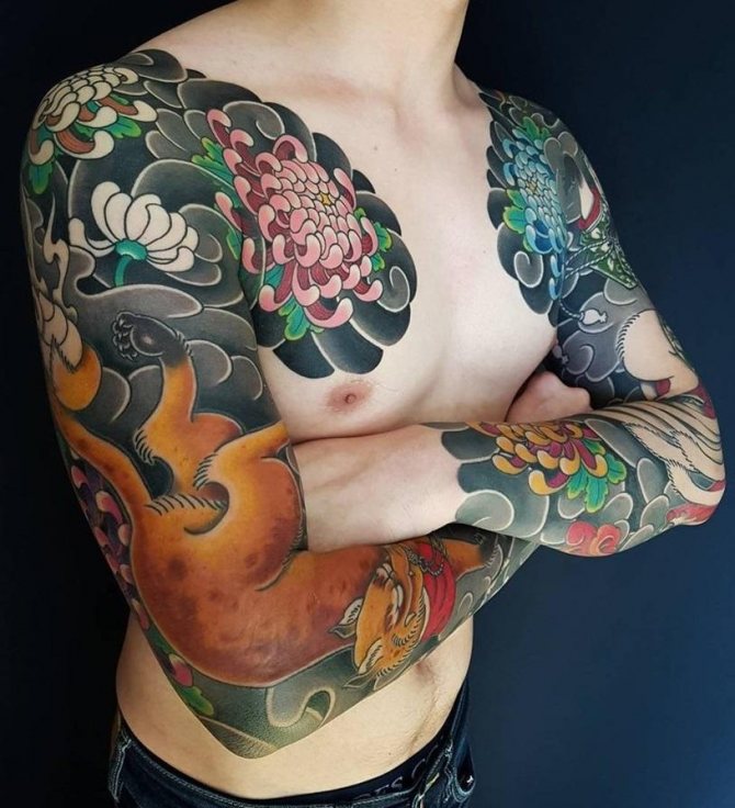Technique dite "orientale". Le plus souvent avec l'utilisation du rouge, du noir, de l'or, du jade. Motifs de tatouage populaires sur le bras :
