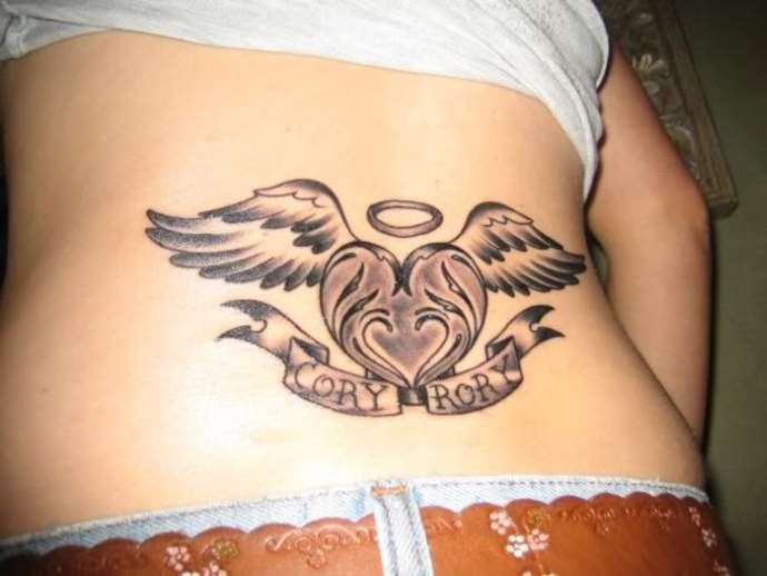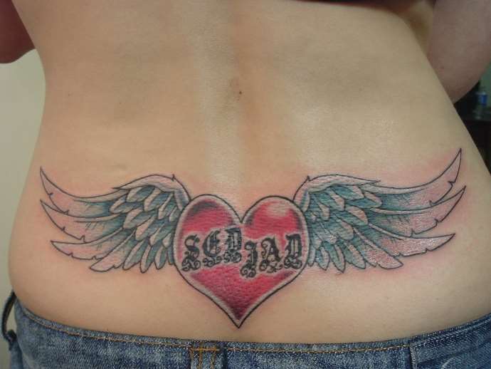 Le cœur noir et blanc sur le coccyx a l'air original. L'image indique que le porteur est un romantique. S'il y a des pistolets à côté du symbole de l'amour, cela indique une triste expérience passée et que la femme ne croit plus en l'amour.