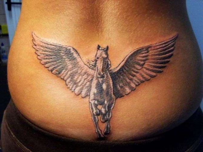 Certaines femmes couvrent non seulement la zone du coccyx mais aussi une partie de leur dos avec un tatouage. Dans ce cas, une grande esquisse d'une image en couleur convient.