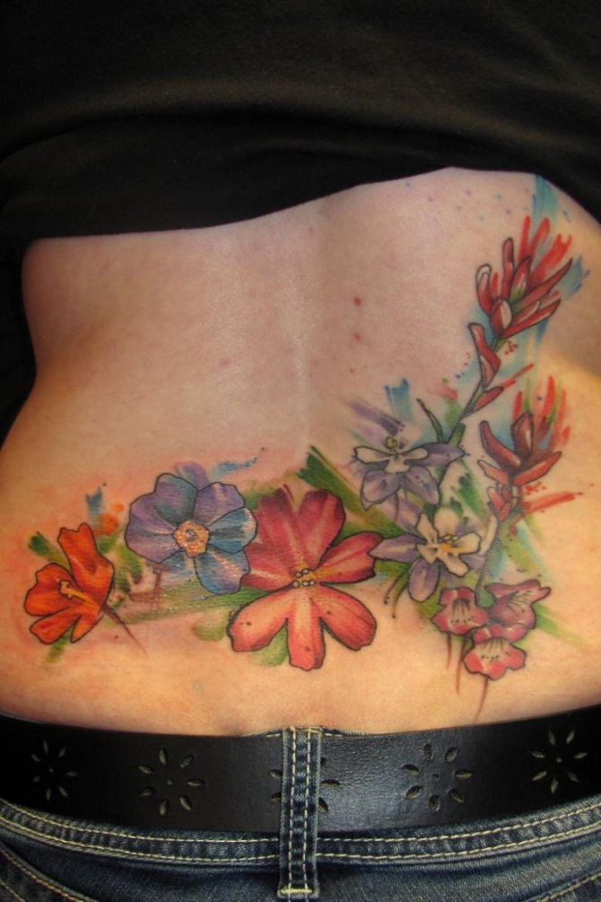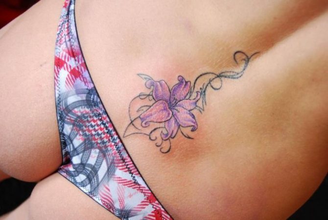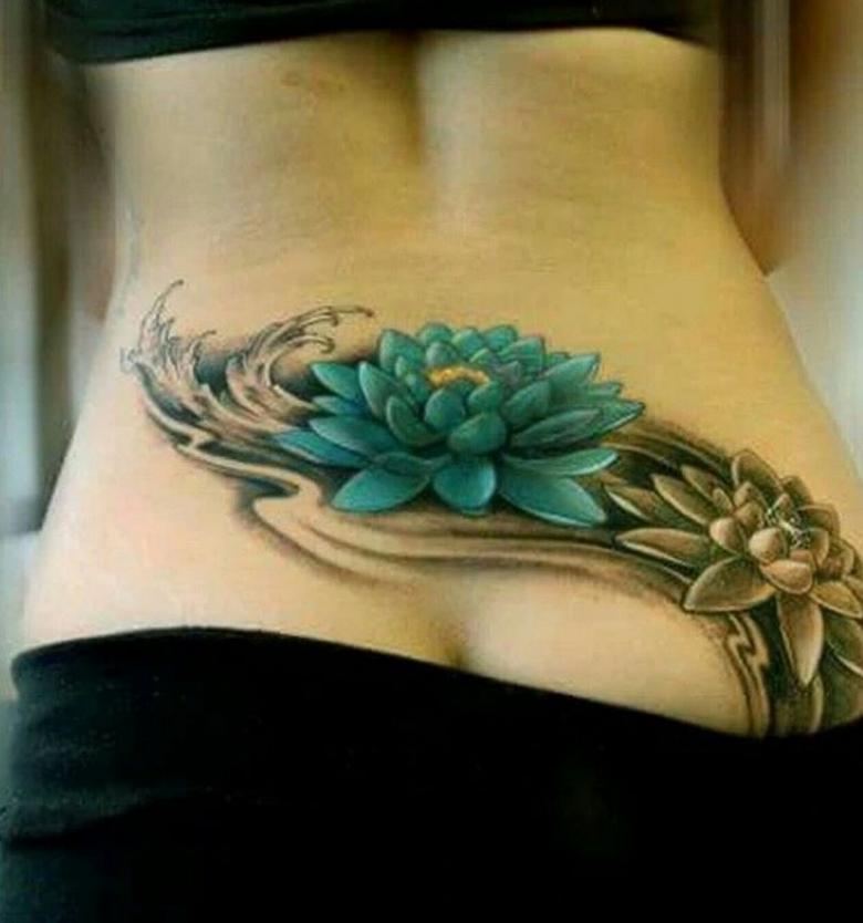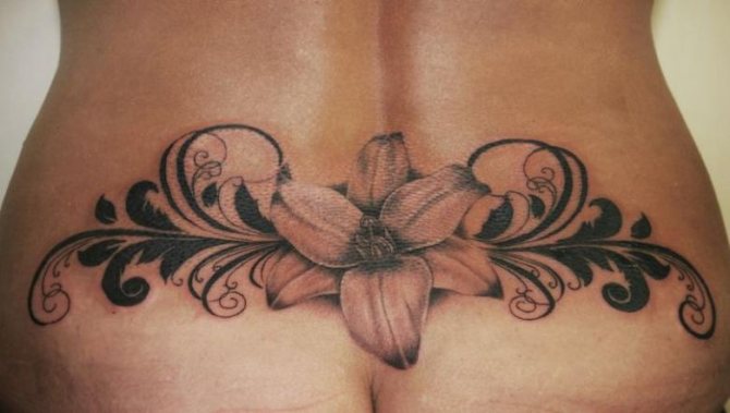 En plaçant une fleur sur son coccyx, une fille communique aux autres qu'elle a beaucoup de vitalité et d'énergie. Ce tatouage dénote l'amour et l'harmonie de l'âme.