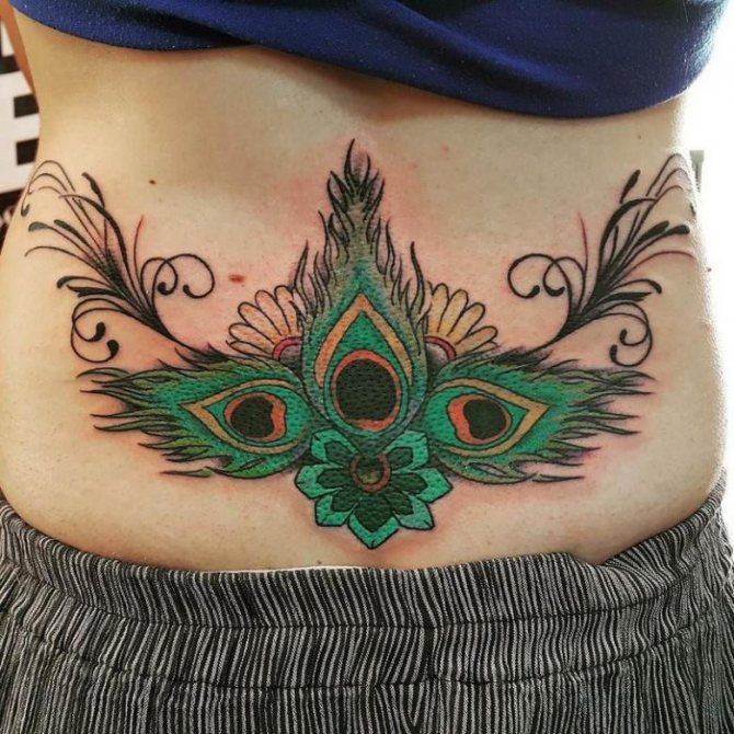 Plume sur le coccyx - symbole de légèreté et de féminité. Il est également un symbole de liberté et d'indépendance vis-à-vis de l'opinion publique.
