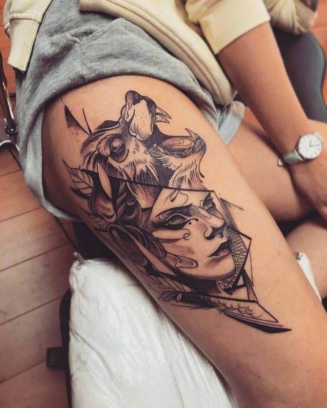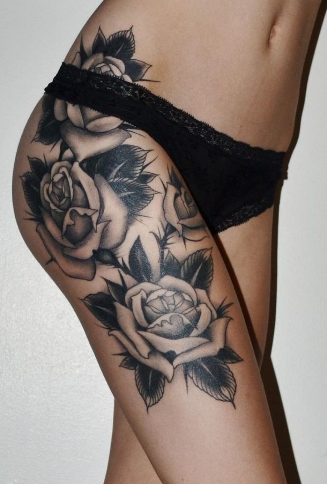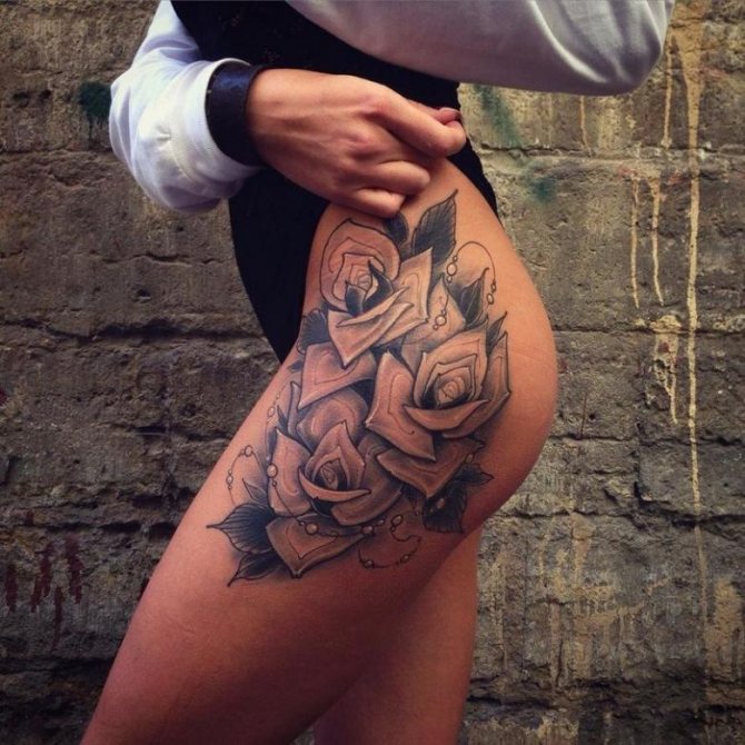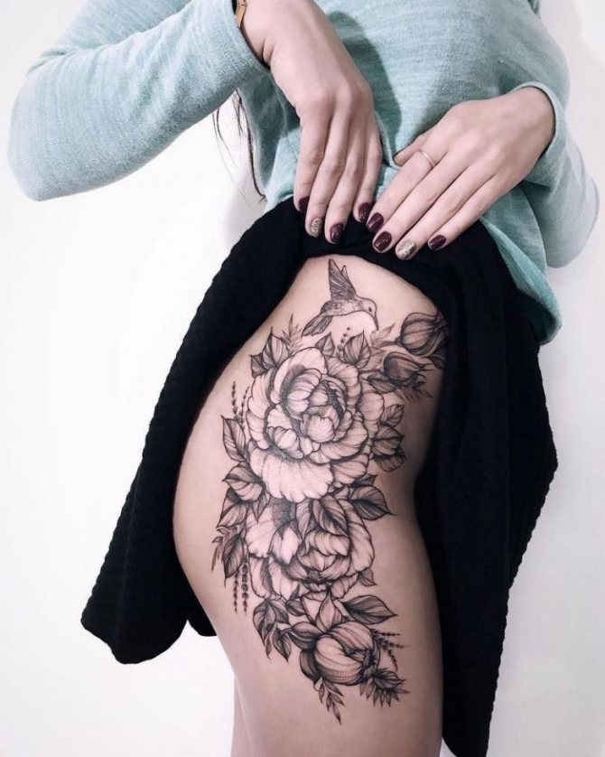 En outre, lorsque vous choisissez un motif de tatouage de la hanche, vous devez tenir compte du facteur âge. Les cuisses sont les plus touchées par les variations de poids, les vergetures, la cellulite, etc. Par conséquent, l'image souffrira également lors de la "correction" naturelle de la surface. Par conséquent, les dames sujettes à l'obésité ou peu habituées à surveiller l'état de leur corps ont intérêt à refuser le tatouage à grande échelle au profit de petites peintures.