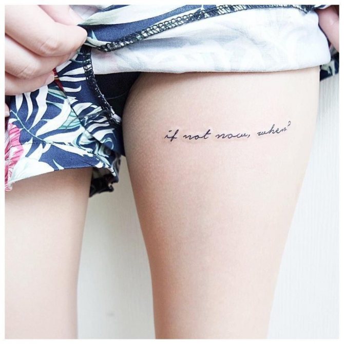Pour bien voir le tatouage sur le côté de la cuisse, la fille doit être en bikini. Et bien sûr, un tel tatouage est moins douloureux, car la peau est ici plus dense.