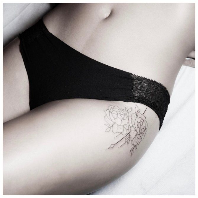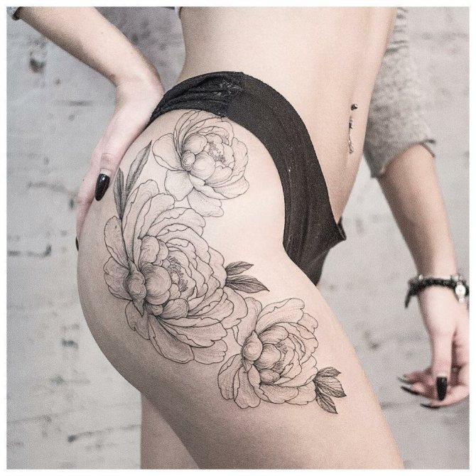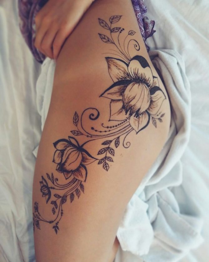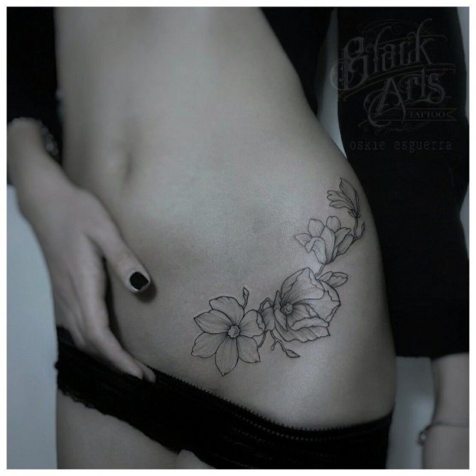 Le thème le plus populaire pour un tatouage sur la hanche est celui des fleurs. Les filles les bourrent comme une image, car c'est le moyen le plus simple et le plus efficace de se sentir douce, spéciale et féminine.