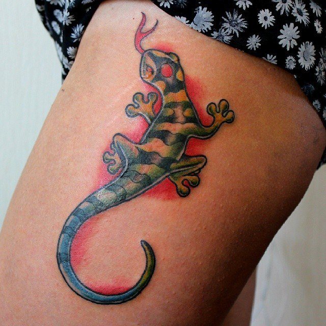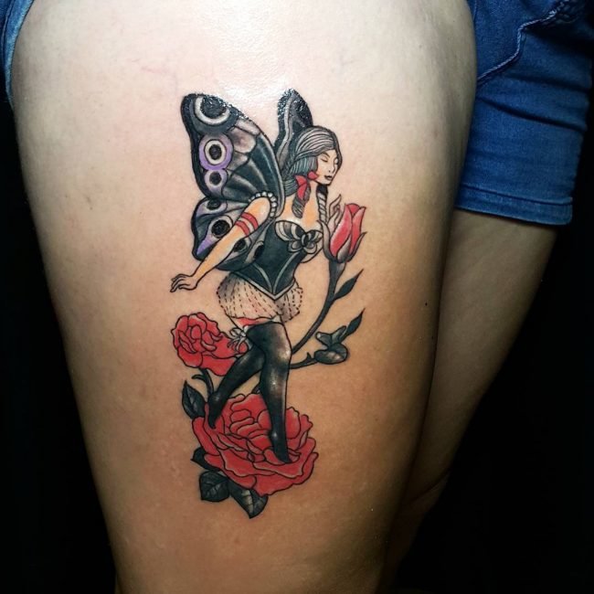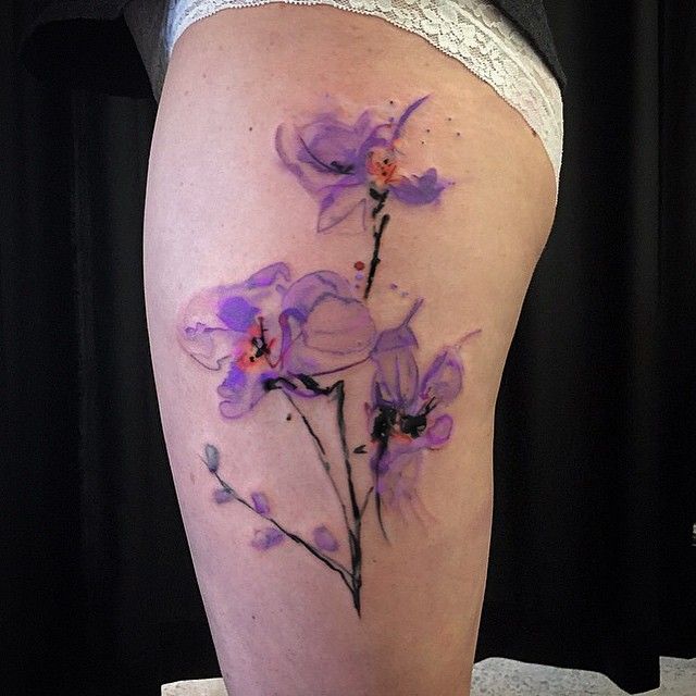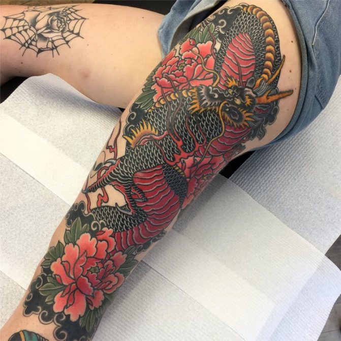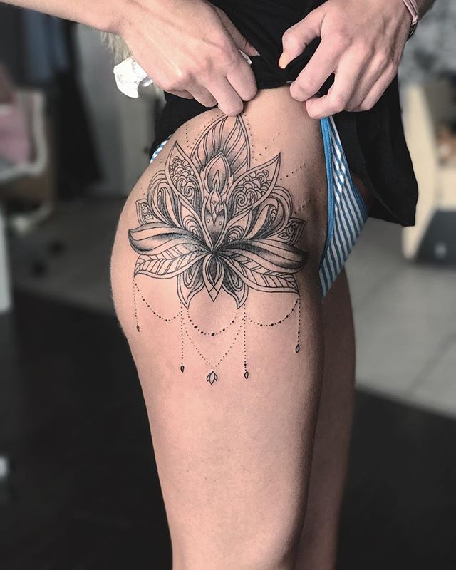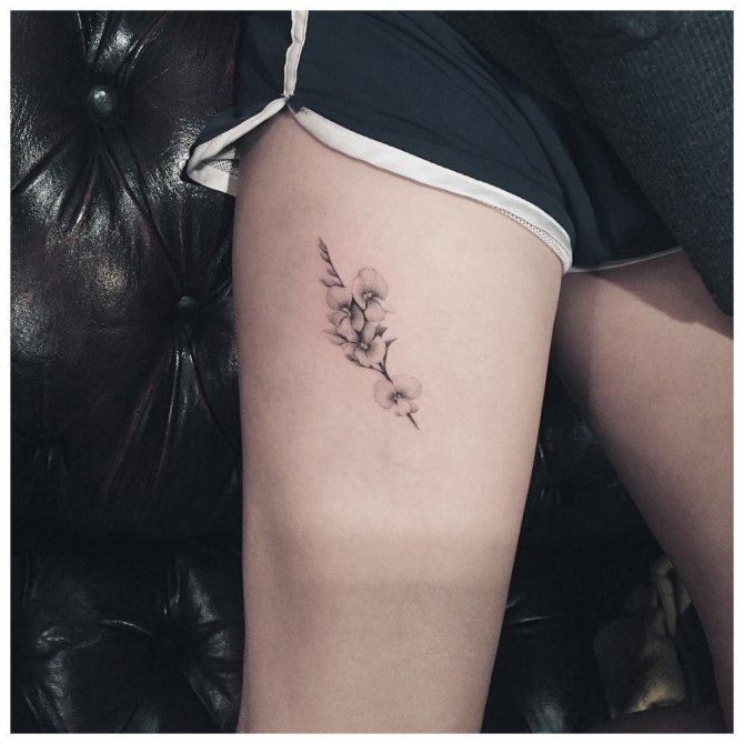 Un tatouage moins important, mais toujours populaire, sur les cuisses pour les filles. La peau de cette partie du corps est fine, ce qui signifie que le processus de tatouage est plus douloureux.