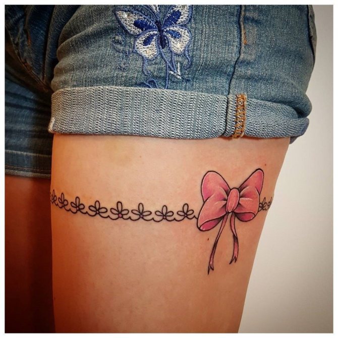 La façon la plus courante pour une belle femme d'avoir un objet d'apparence féminine comme une jarretière sur ses cuisses. Ce type de tatouage est idéal pour les filles qui sont coquettes et même volages.