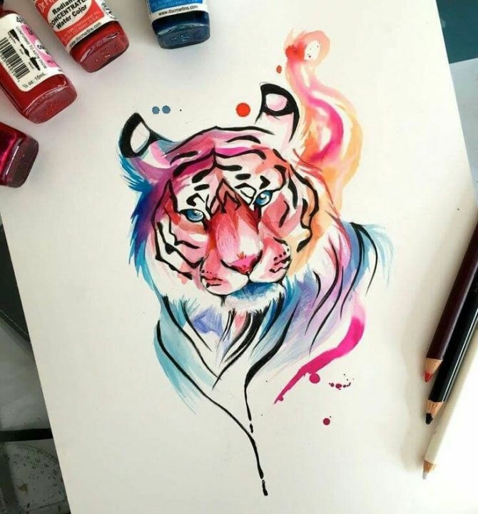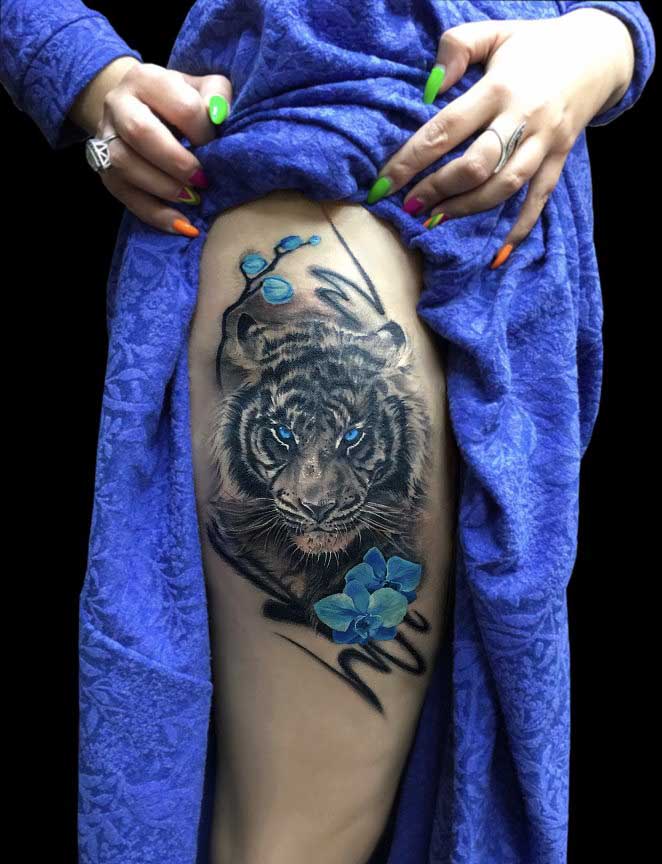 Un tatouage de tigre à l'aquarelle peut orner les cuisses sur le devant ou le côté.