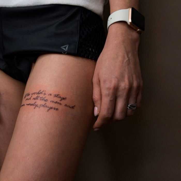 Contrairement au tatouage de l'os pelvien, celui de la cuisse peut être montré aux autres pendant les mois les plus chauds. Avec des shorts courts et une mini-jupe, il sera clairement visible.