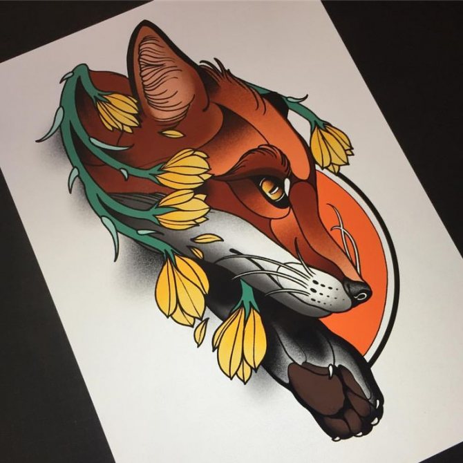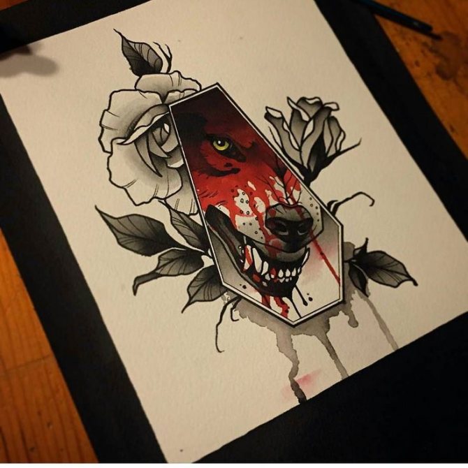 Tatouage original de loup combiné à des fleurs, comme dans ce croquis.