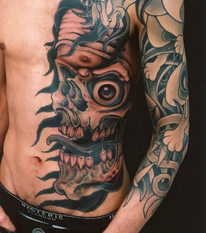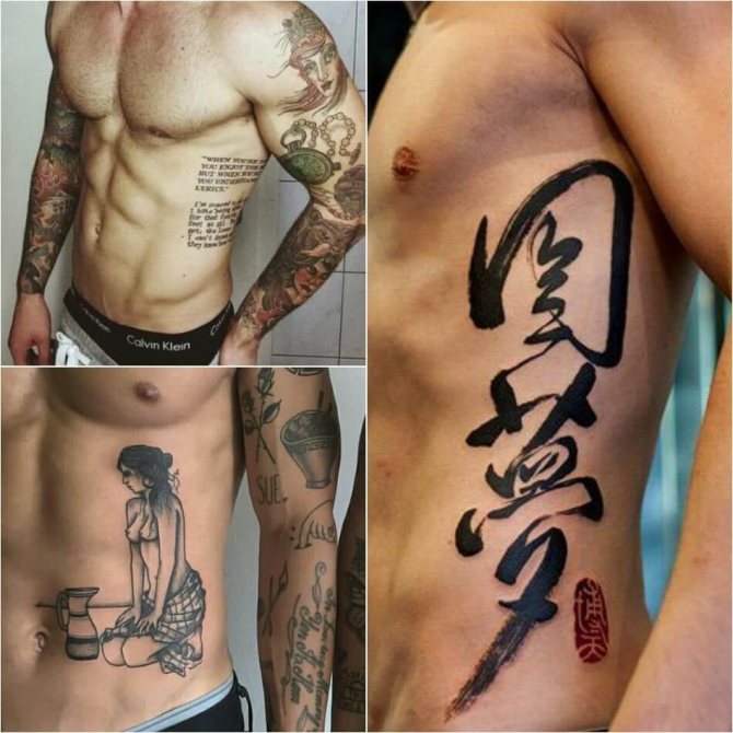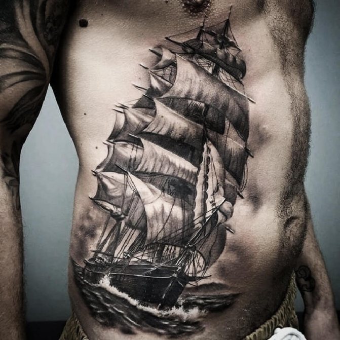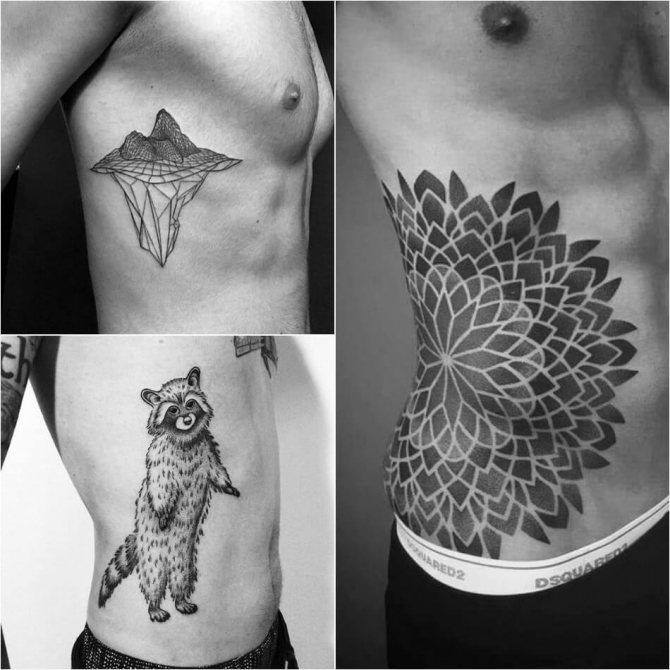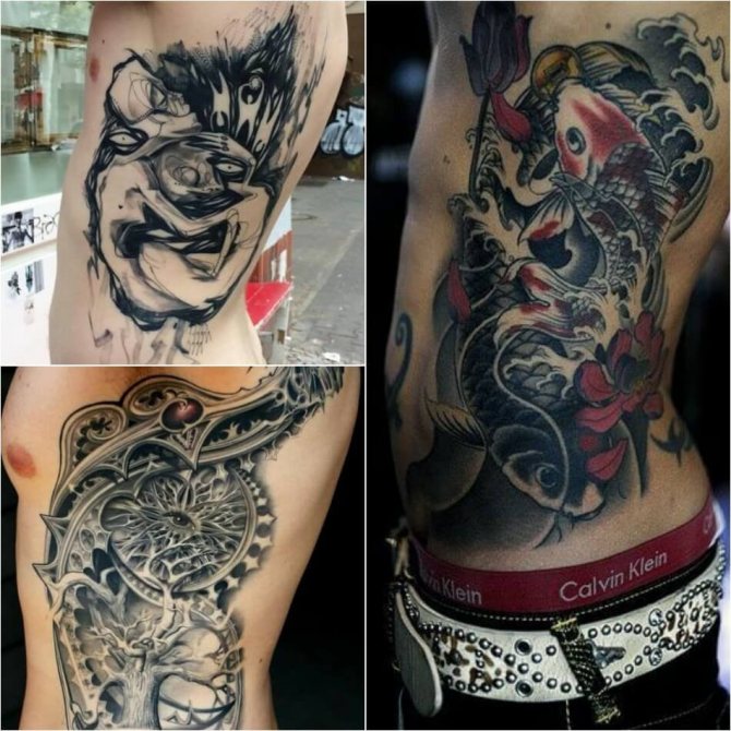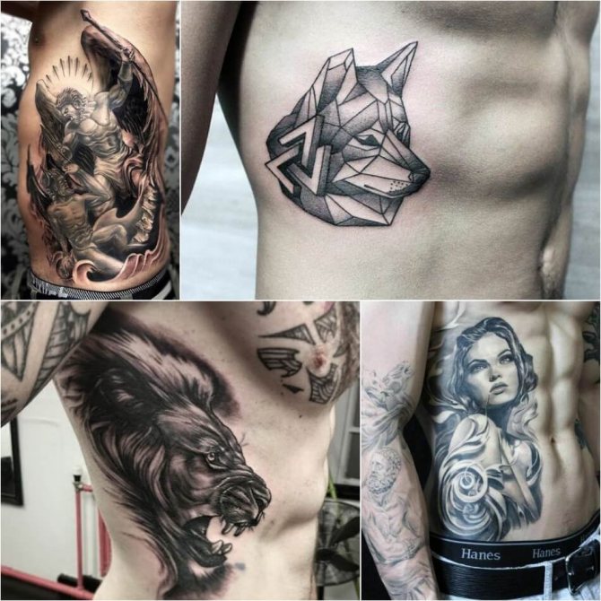 Le tatouage des côtes est très populaire chez les hommes et souvent, les membres de la moitié la plus forte de l'humanité utilisent des tatouages monochromes noirs et blancs. Le tatouage le plus populaire sur les côtes des hommes est l'image d'un bateau à voile, voguant sur les vagues. Ce tatouage était autrefois utilisé par les marins afin qu'en cas de décès, il puisse être identifié et enterré comme les marins sont censés l'être. Mais aujourd'hui, un tel tatouage témoigne du caractère épris de liberté de son propriétaire. Les tatouages populaires sur les côtes des hommes comprennent des images de thèmes religieux, des croix, des animaux et des oiseaux sauvages, ainsi que des habitants des profondeurs de la mer. Les images d'un dragon, d'un crâne ou d'une fille nue sont également populaires. Aujourd'hui, il est possible de rencontrer des tatouages d'hommes avec des images de fleurs, comme des iris. Cette fleur symbolise le courage et la force. Chez les hommes, un tatouage sur les côtes sous forme d'inscriptions diverses est très populaire. Contrairement aux tatouages féminins, les inscriptions des tatouages masculins sont appliquées dans un style plus agressif.