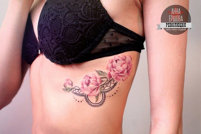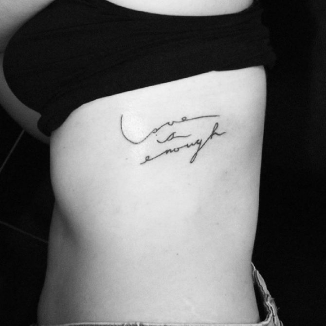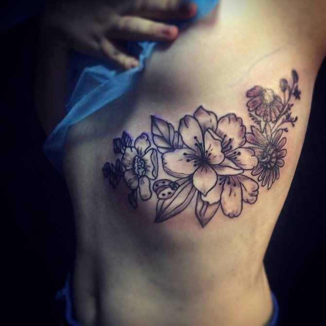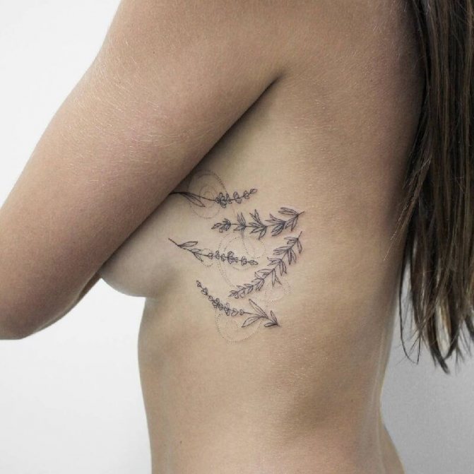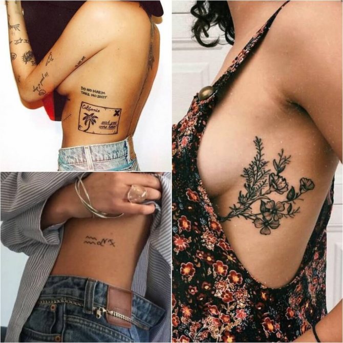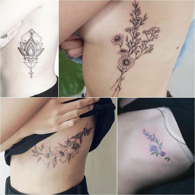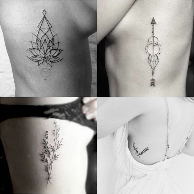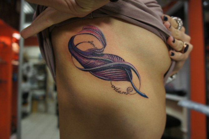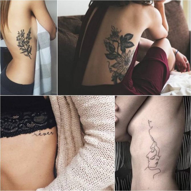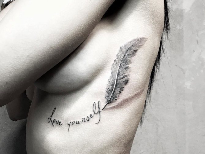 Le choix d'un motif pour un tatouage sur les côtes doit être abordé de manière très sérieuse et approfondie. Bien qu'un tatouage sur les côtes ne soit pas destiné à être vu par le public, vous devez quand même le voir pour le reste de votre vie. Il est donc nécessaire de choisir soigneusement l'image et le lieu d'application. Souvent, une fougère ou un colibri lumineux est le bon choix pour un tatouage de côte. Magnifique attrape-rêves, l'image de papillons, dragon, diverses fleurs et plumes. L'image merveilleuse et attrayante sur les côtes sera l'oiseau phoenix et d'autres images lumineuses. Excellente option tatouages sur le côté - inscriptions originales. Il peut s'agir de phrases ou de citations ailées. Lorsque vous choisissez un motif pour un tatouage sur les côtes, faites preuve d'imagination.
