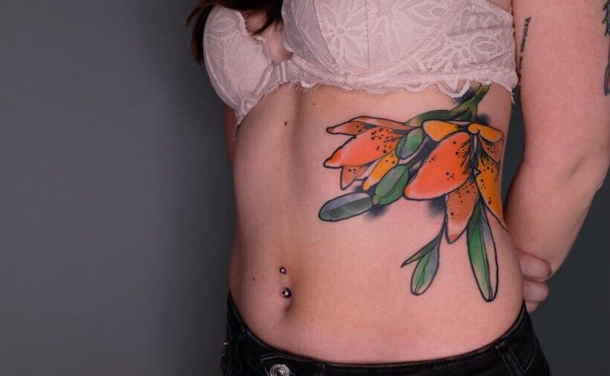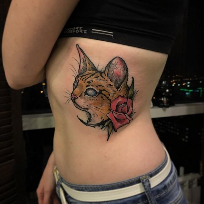 Le tatouage sur les côtes des filles d'aujourd'hui est très populaire, surtout qu'il se remarque pendant la saison estivale des plages. Le principal avantage de ce tatouage est la possibilité de l'exposer en public ou, au contraire, de le cacher des regards indiscrets. Un tatouage corporel sur les côtes accentuera parfaitement la beauté de la silhouette et des abdominaux d'une femme. C'est pourquoi les côtes sont souvent tatouées sur les athlètes féminines et les filles qui se maintiennent en forme à la salle de sport. Un tatouage d'une inscription, de fleurs, d'oiseaux ou de plumes serait très joli sur le côté d'une femme. L'inscription peut être courte, composée de quelques mots, ou volumineuse, contenant plusieurs phrases. Aujourd'hui, on peut souvent voir de tels tatouages chez les stars d'Hollywood. Les petits tatouages de cœurs, de lune et de soleil, de roses ou de lys sont également populaires parmi le beau sexe. Belle et envoûtante image d'animaux, par exemple un chat ou une lionne du côté féminin. Si une fille choisit un tatouage représentant des oiseaux, cela montrera sa légèreté de caractère et une certaine légèreté de la nature.