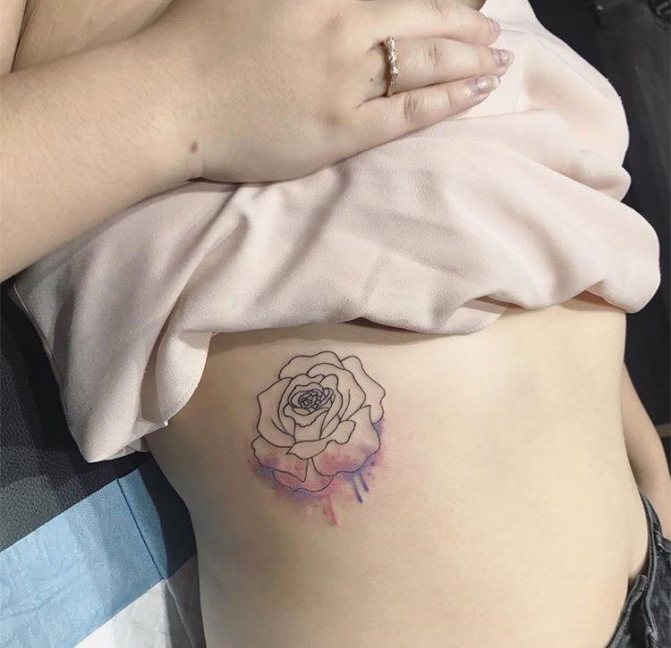 Les tatouages de style aquarelle sont toujours colorés et accrocheurs. Les belles peintures aux contours doux sont superbes sur les côtes. Un tel tatouage transmet des sujets pittoresques et les flous colorés rendent le dessin plus inhabituel et unique. Les tatouages à l'aquarelle sur les côtes sont très populaires auprès des hommes et des femmes. Dans ce cas, la taille de l'image n'a aucune importance. Un tatouage volumétrique de style aquarelle est un motif accrocheur et hypnotique. Mais aussi mignon et beau sera regarder une telle petite taille de tatouage.